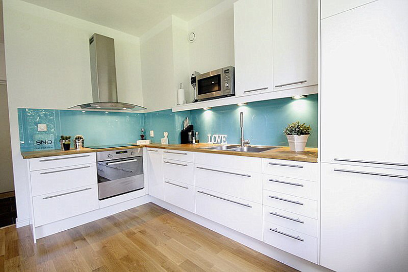Note! The best care is to wipe the decorative kitchen apron with a slightly damp sponge as it gets dirty. A good cooker hood over the stove minimizes the grease suspension and burning that settles on all kitchen surfaces.