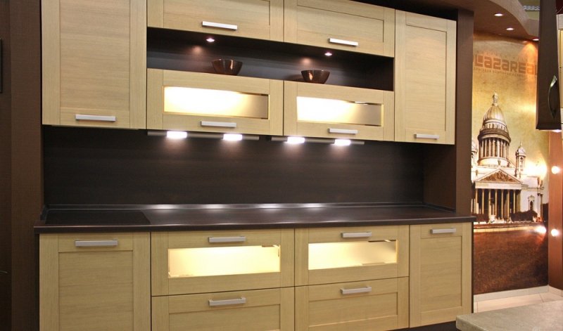 - General design with cladding for a dinette set or cabinet furniture. To some, the way of finishing, when everything merges, seems boring. Others, on the contrary, prefer that one surface as if flows into another, without sharp contrasts and accents.