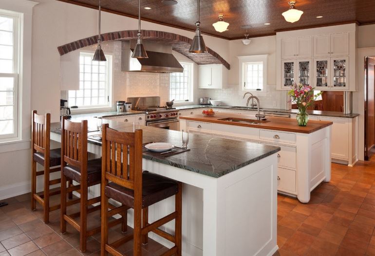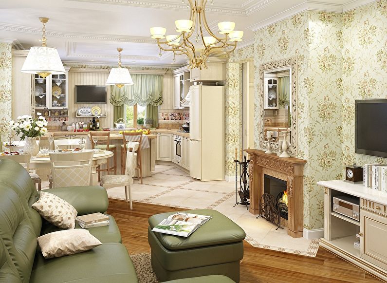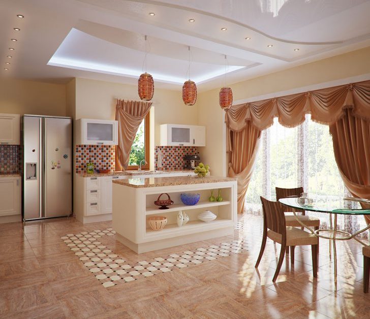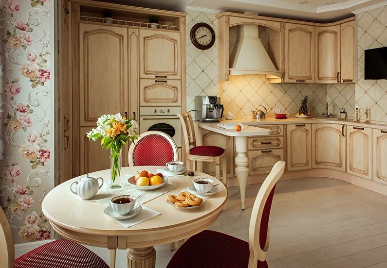 | Classic | This direction is often chosen by the owners of large, luxurious mansions. Classics are characterized by: expensive repairs, beautiful decor, a certain pomp of the room. For decoration, wood, wallpaper, stretch ceiling structures are used. Curtains should be multi-layered, textiles - only natural. The color scheme of the kitchen should be calm. Ideal white, olive, brown colors. |