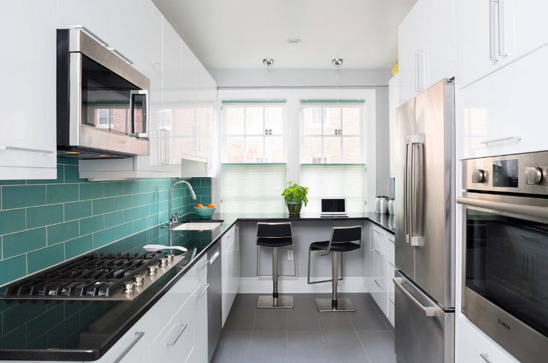 In a small kitchen-dining room, it is better to replace the usual dining table with a bar counter, a transforming table. A classic table for the whole family will take up too many square meters, make the room uncomfortable. The bar counter is ideal for a small family. If everyone does not have enough space, you can buy transforming furniture.
