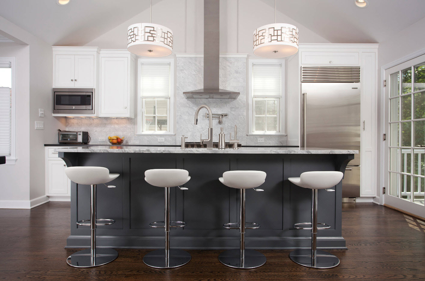 This kitchen looks amazing bright thanks to the contrast dining group