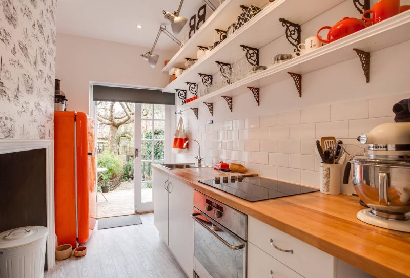 It is more difficult to furnish a narrow kitchen, most likely a linear layout in one or two rows is suitable. It makes sense to use the space under the window