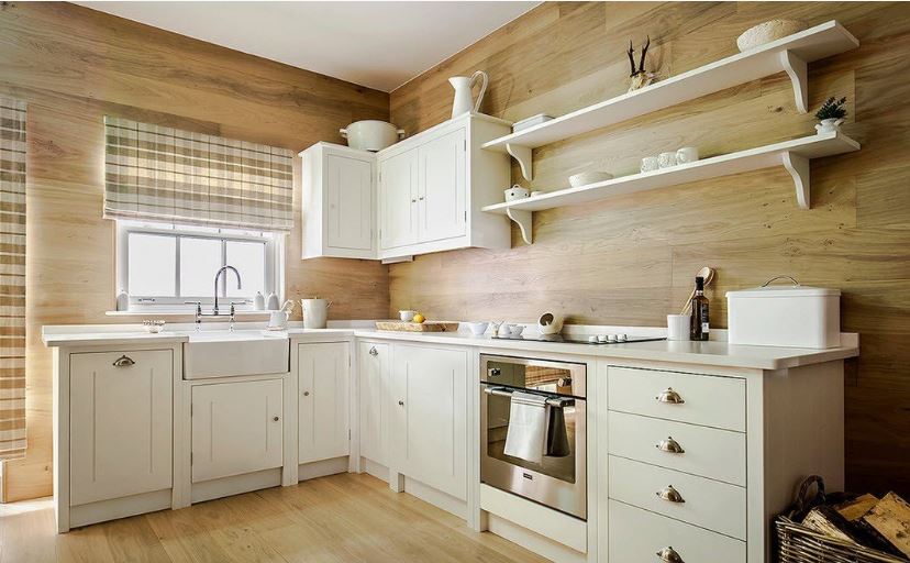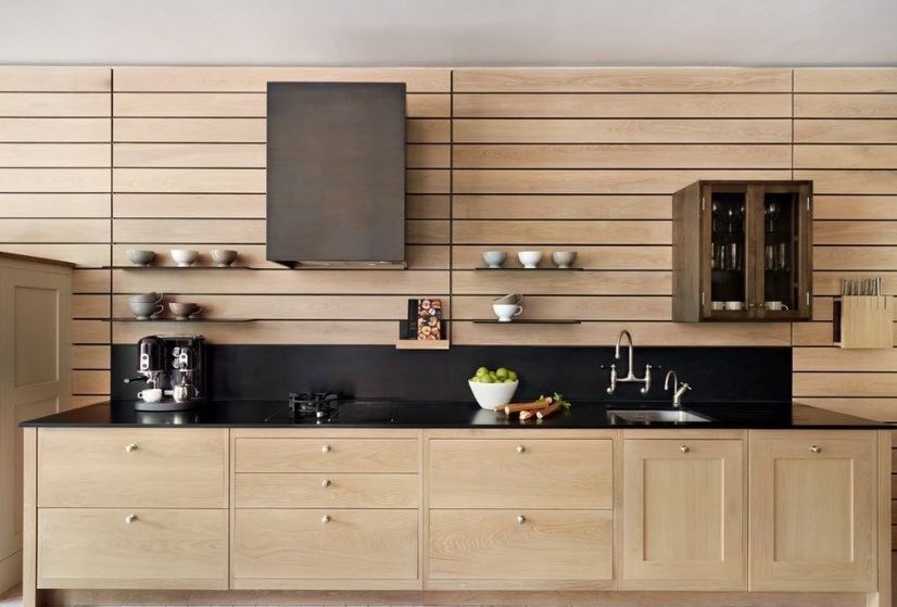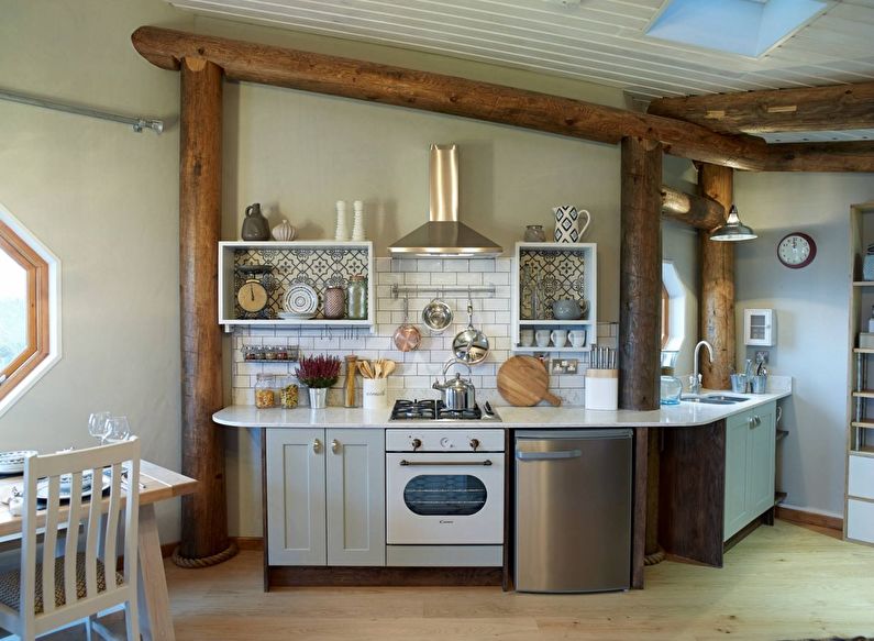 The walls of the room can be left wooden, just covering them with paint, varnish. If the structure is brick, you can decorate the walls with expensive, dense wallpaper. Wallpaper is best used in the dining area. The workspace is usually tiled. The tile is fireproof, easy to clean, and has a beautiful design. The entire wall can be laid with ceramic tiles, its separate part is only an apron. On the walls you can combine different finishing materials. Tiles with decorative plaster, wallpaper with wooden wall panels are well combined.