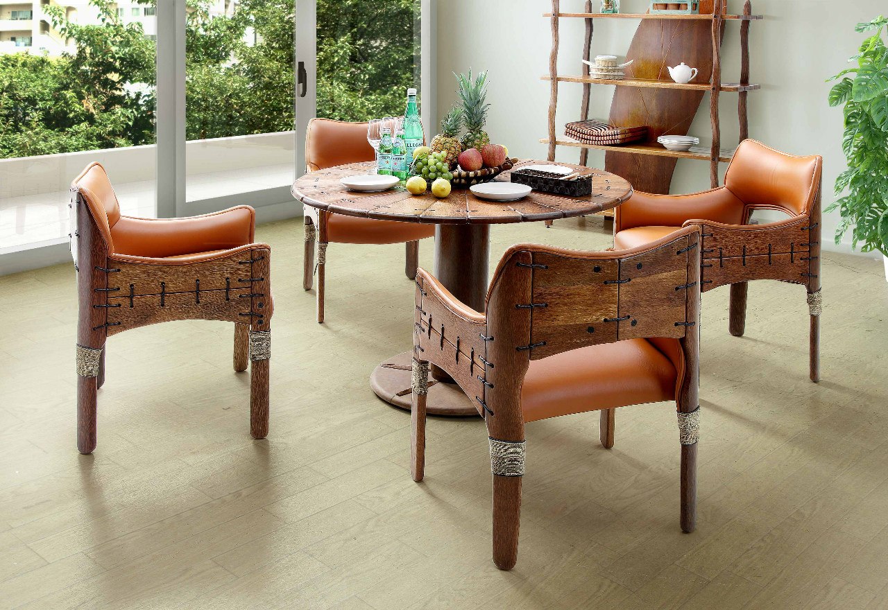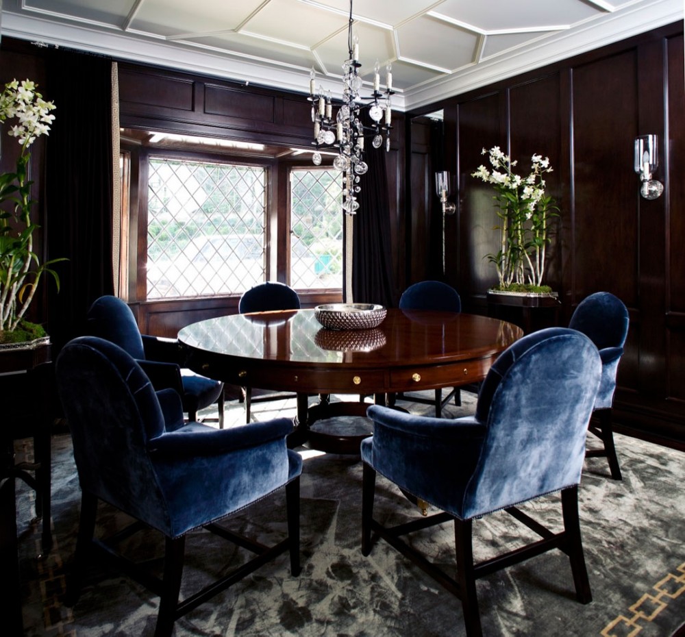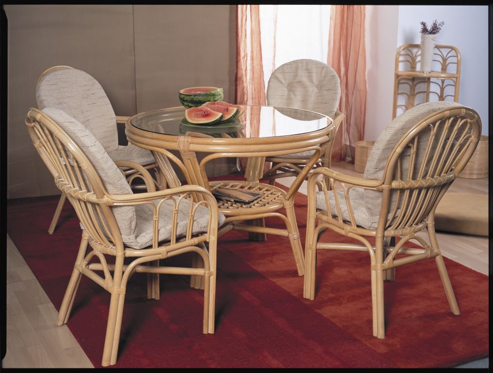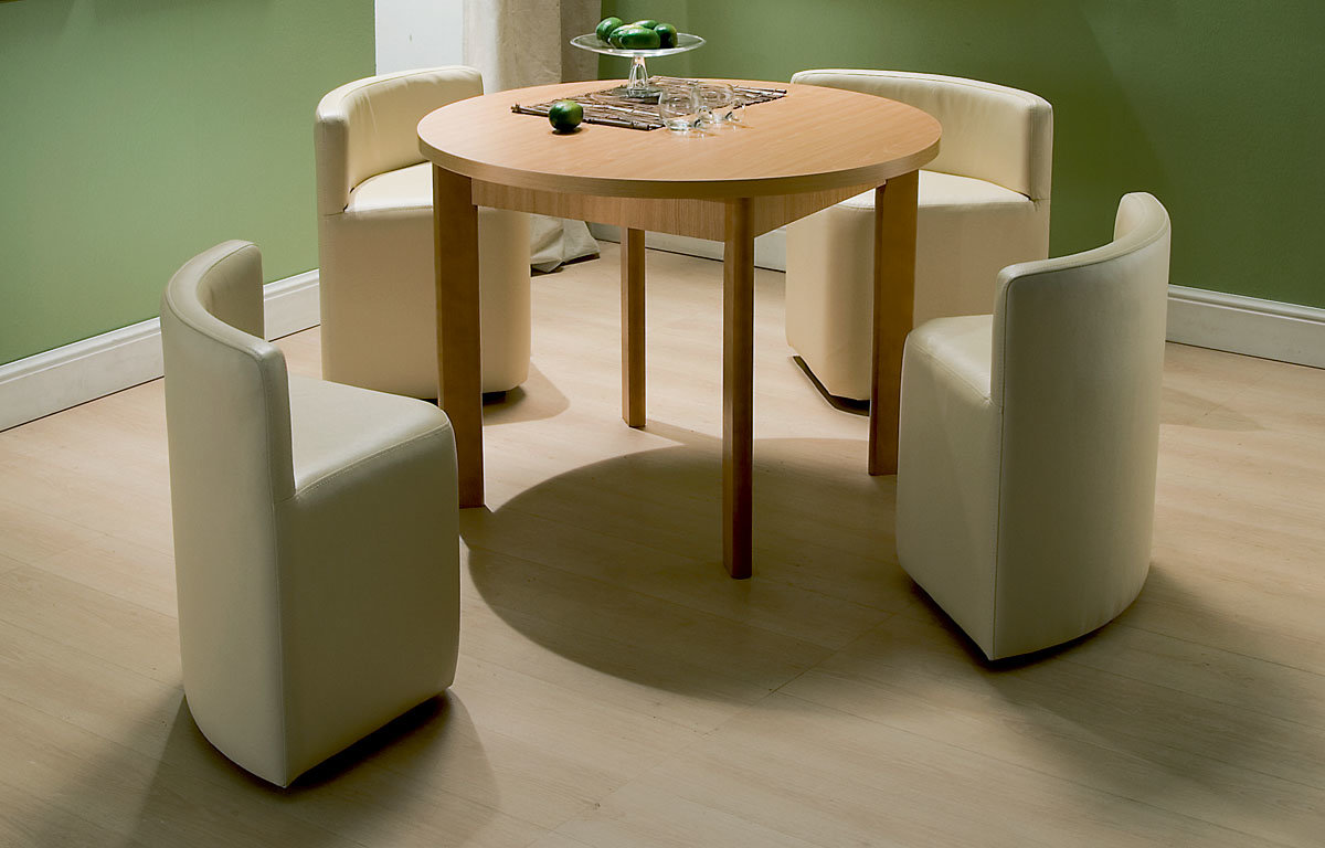Chairs usually complete the round dining table. They combine comfortable soft armrests and a back.