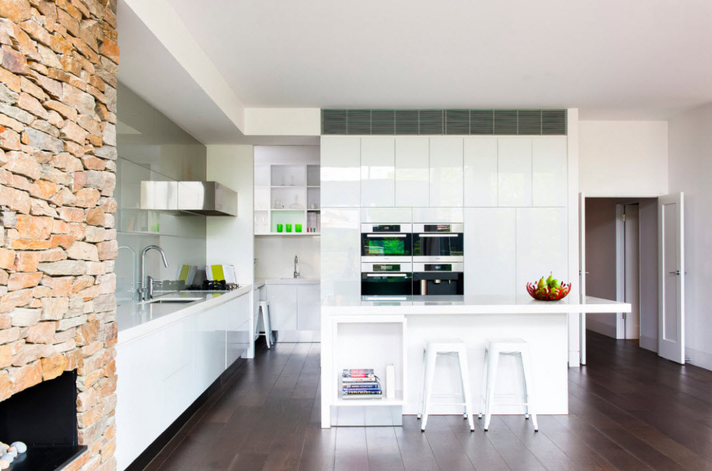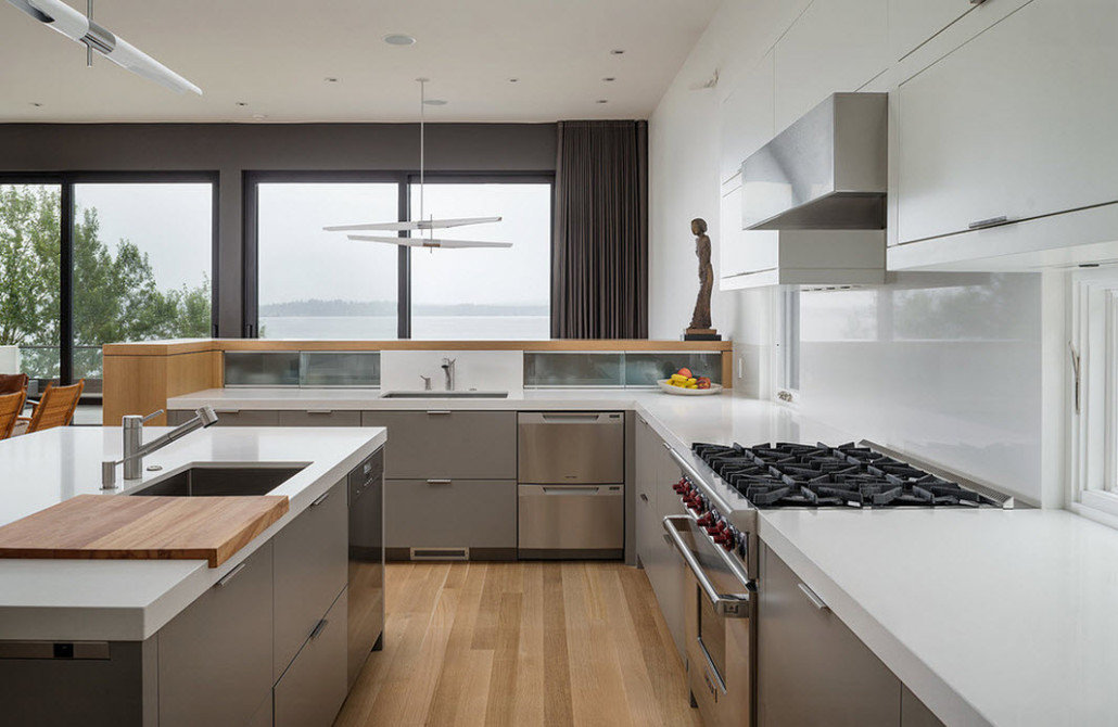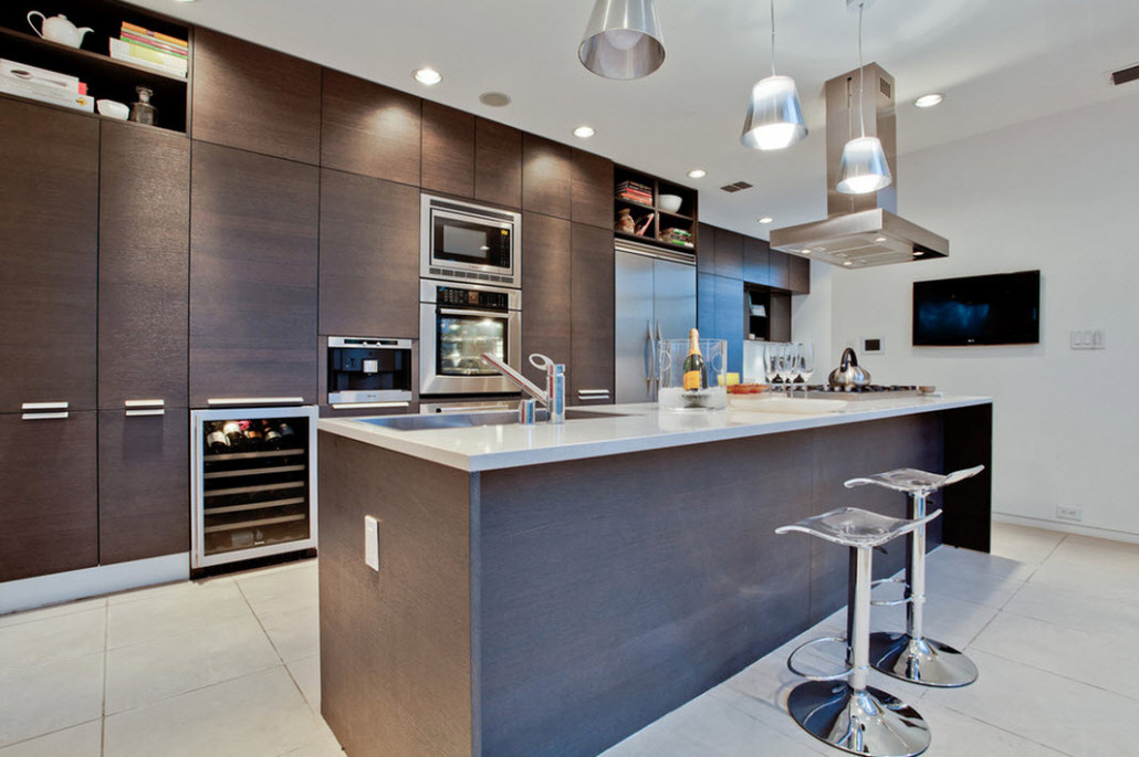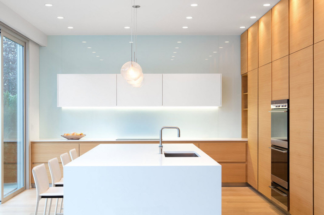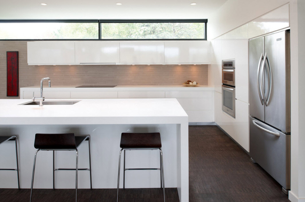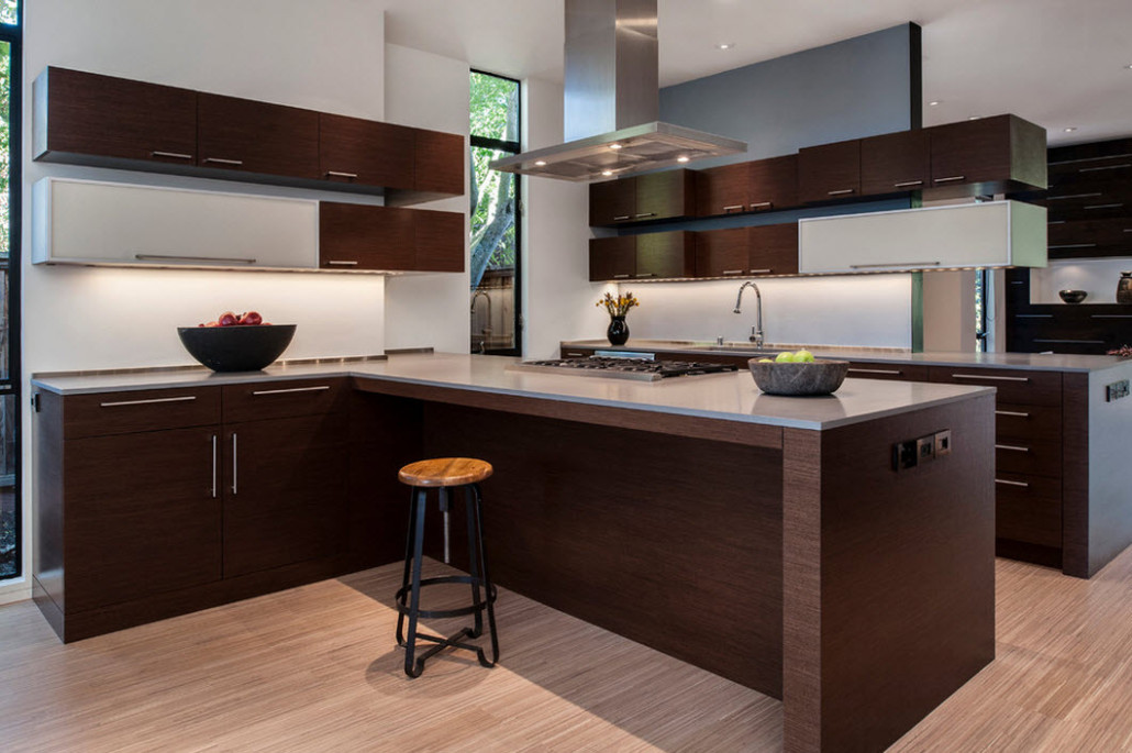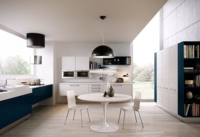 The larger the room, the more design options. In the large kitchen, the most daring designs and colors will harmoniously look. You can build both a modern kitchen corner and choose a U-shape with an island in the center.