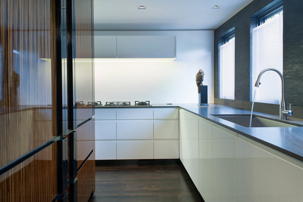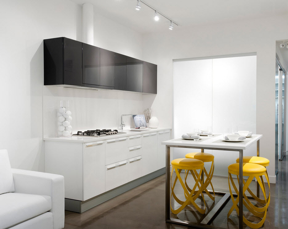 Also, when using glass and metal surfaces. Materials are selected so that care for them requires a minimum of effort. For the same reason, there is no decor, its role is played by color - plain, a combination of shades or a combination of two.