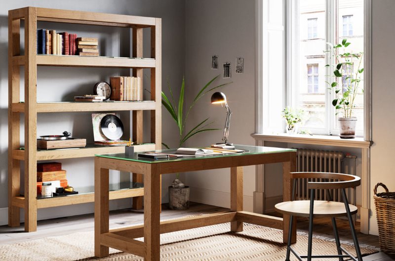 Window frames, skirting boards, flooring, doors are usually made of wood. The door can be made not of a solid array, but with glass inserts.