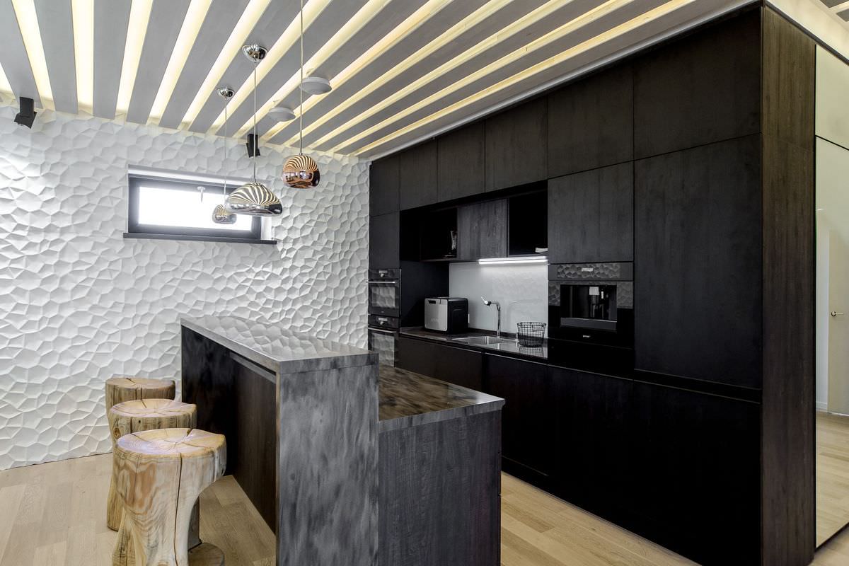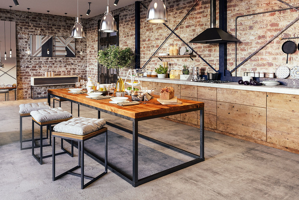 Loft classics - rough brick, rough plastered walls. In some cases, it is possible to paint the walls, finish the coating with cork or wood and stone. The kitchen apron should be made of wear-resistant material. Ceramic tiles, stone, glass - the best options. Ceiling finish is not much different from the usual option - stucco and whitewashing or upholstery with wooden panels. False ceilings are not allowed.