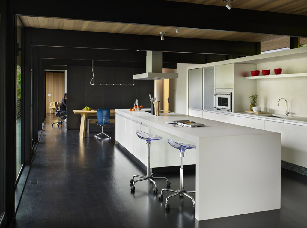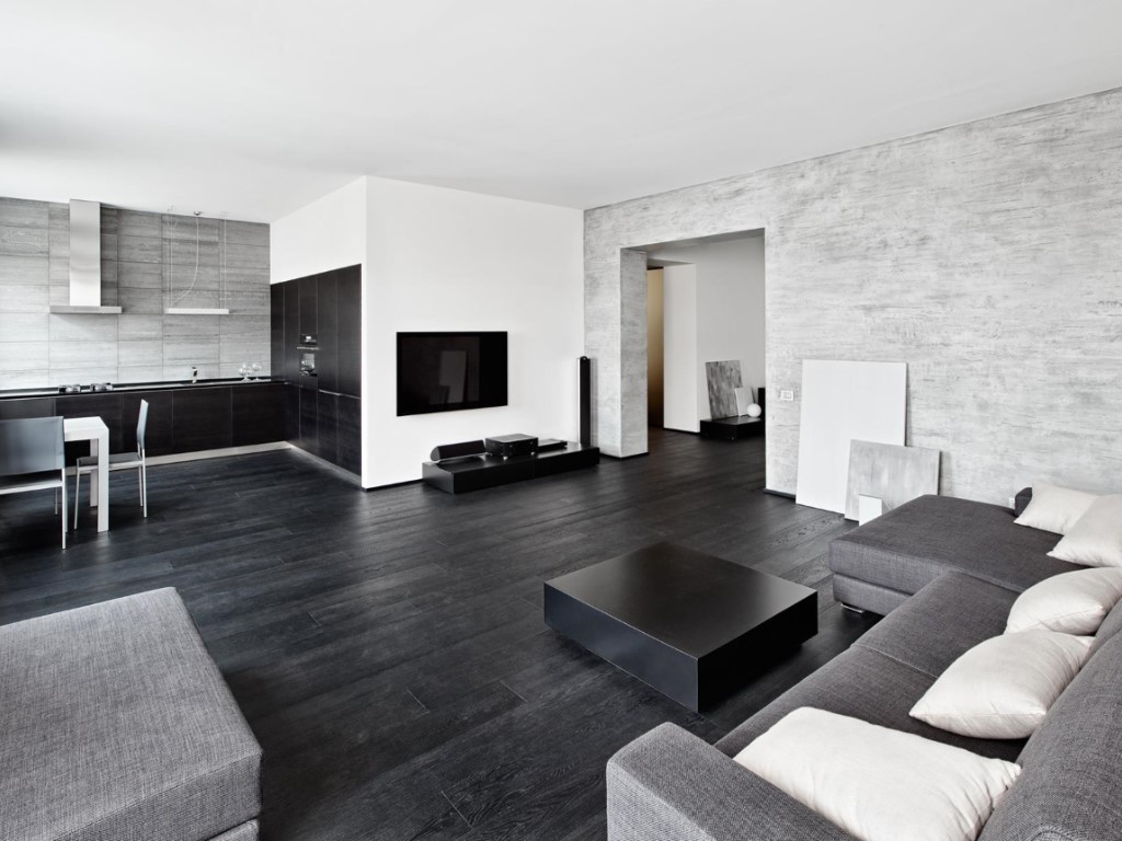Acceptable materials in the interior with a dark floor - glass, chrome materials, wood.