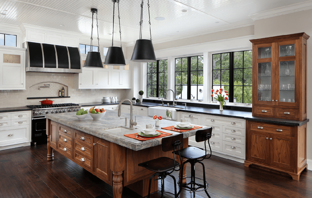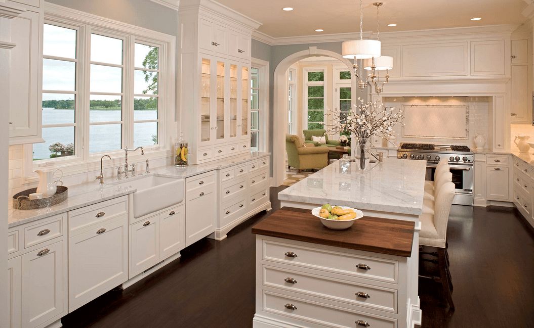 The most successful design decisions are often based on the contrast of two primary colors, with an additional third. The color of the floor may coincide with one of the colors of the furniture, decor, or be the third with a two-color furniture set. In this case, dark details will be appropriate - for example, cabinet handles, apron ornament, frames of decorative elements matching in color.