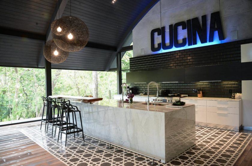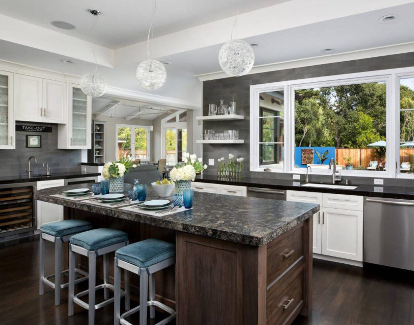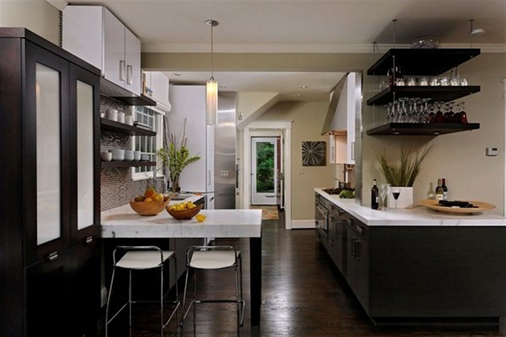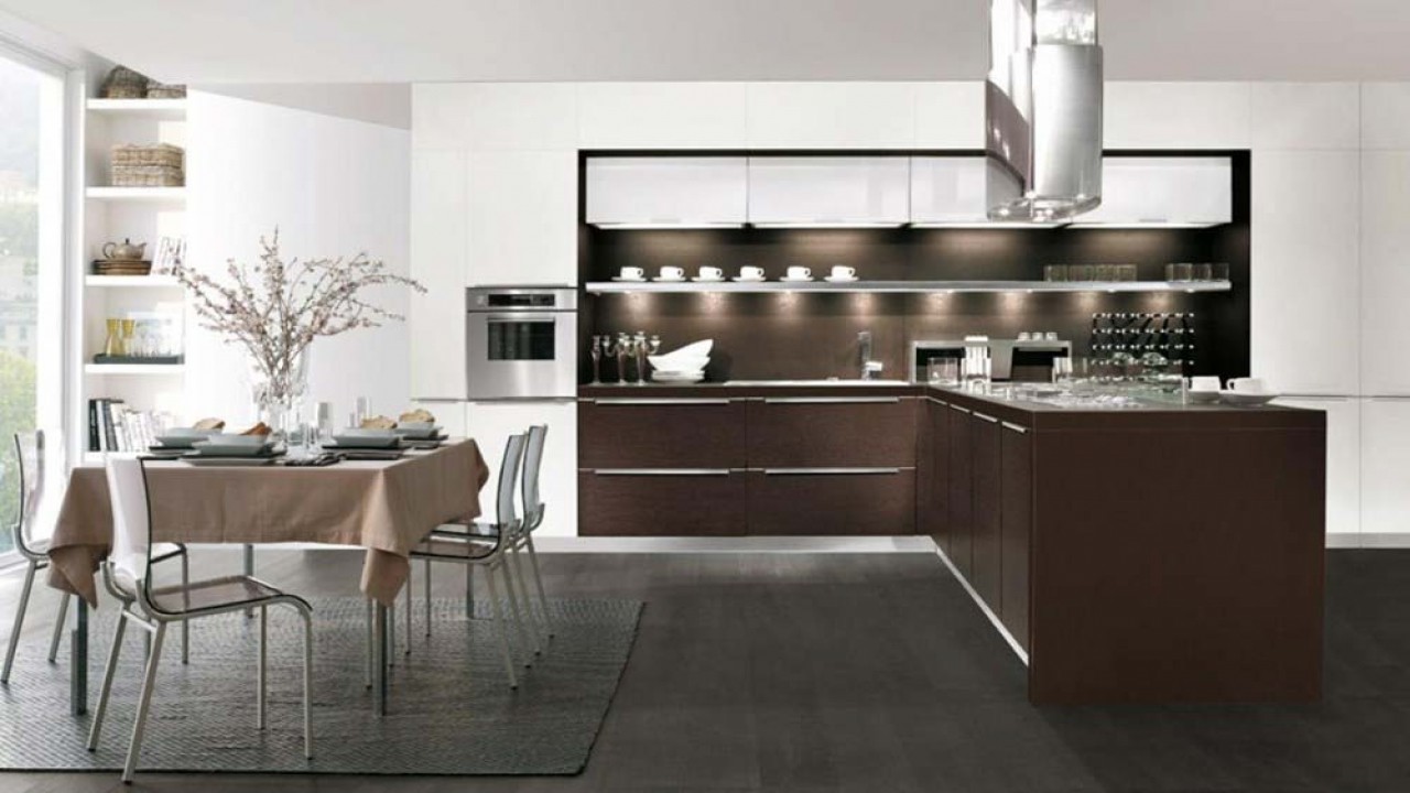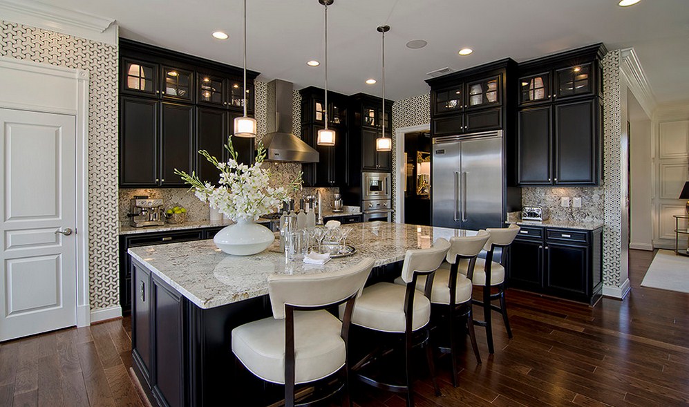 For a designer who decides to offer a black floor in the kitchen, as well as a combination of black with other colors, there are many elegant solutions. You can often find a dark floor in the kitchen, a photo of which shows a light frame with geometric or floral ornaments. This is especially true of private houses or cottages, where they are not constrained by the size of standard apartments, and the kitchen area smoothly passes into the living room or dining area.