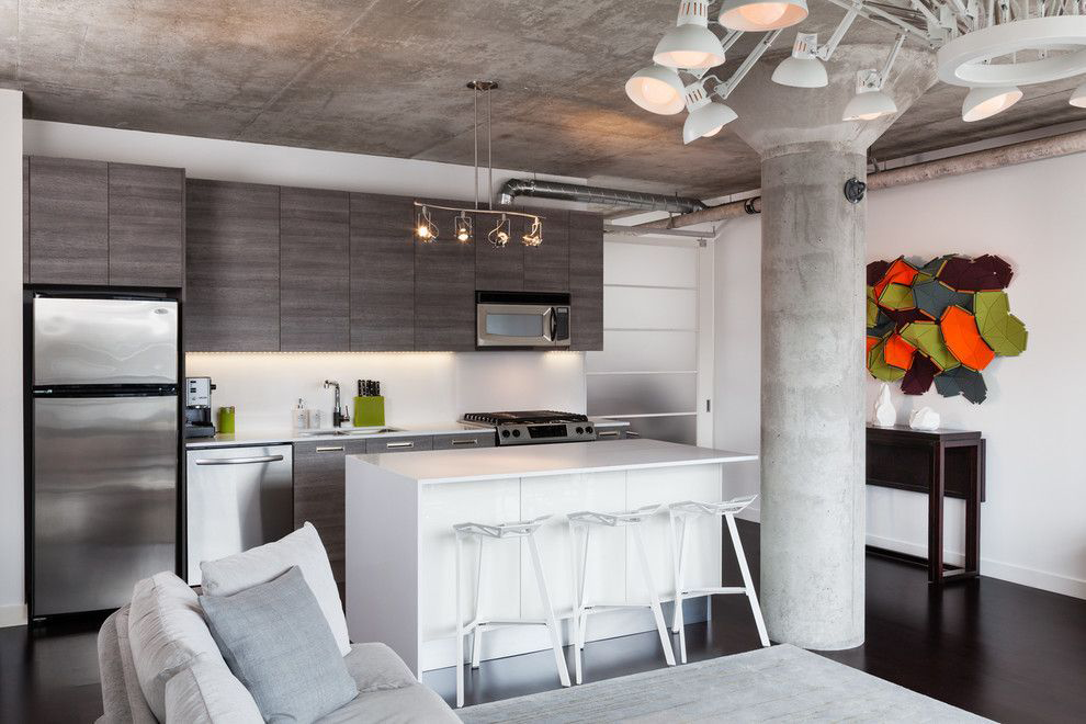 The interior of the kitchen with a dark floor looks fundamental and reliable.