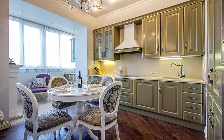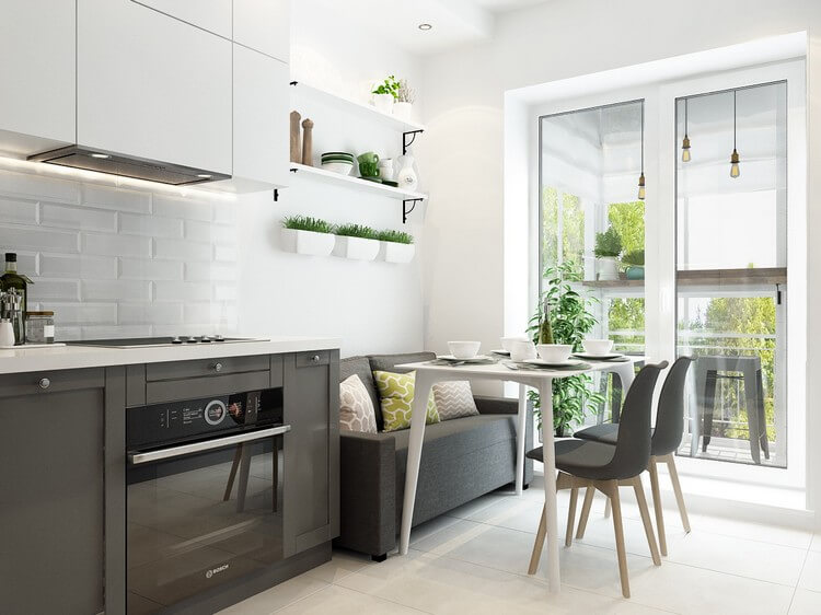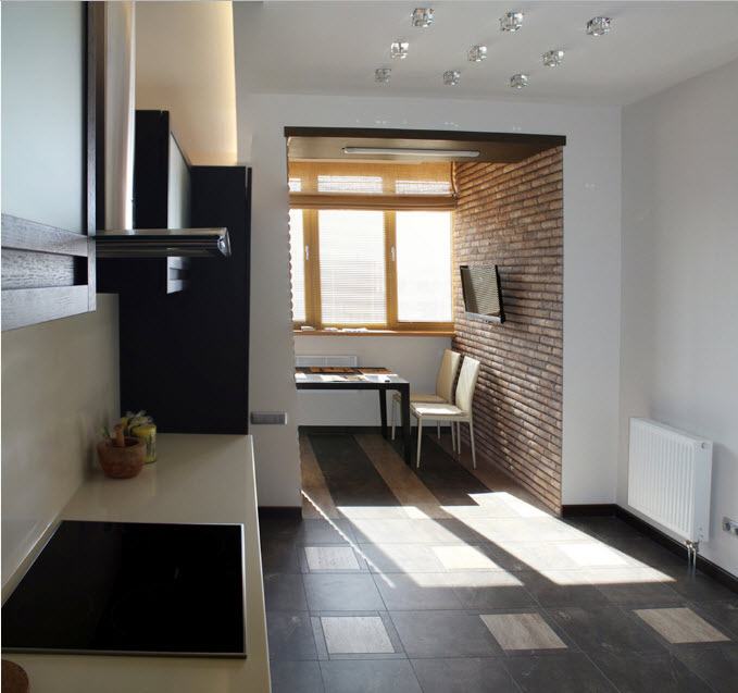 Using the space of the balcony will help to divide the cooking and eating areas. This approach is not only practical, but also very convenient. As a dining room, you can use both the balcony and the kitchen area.