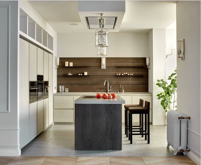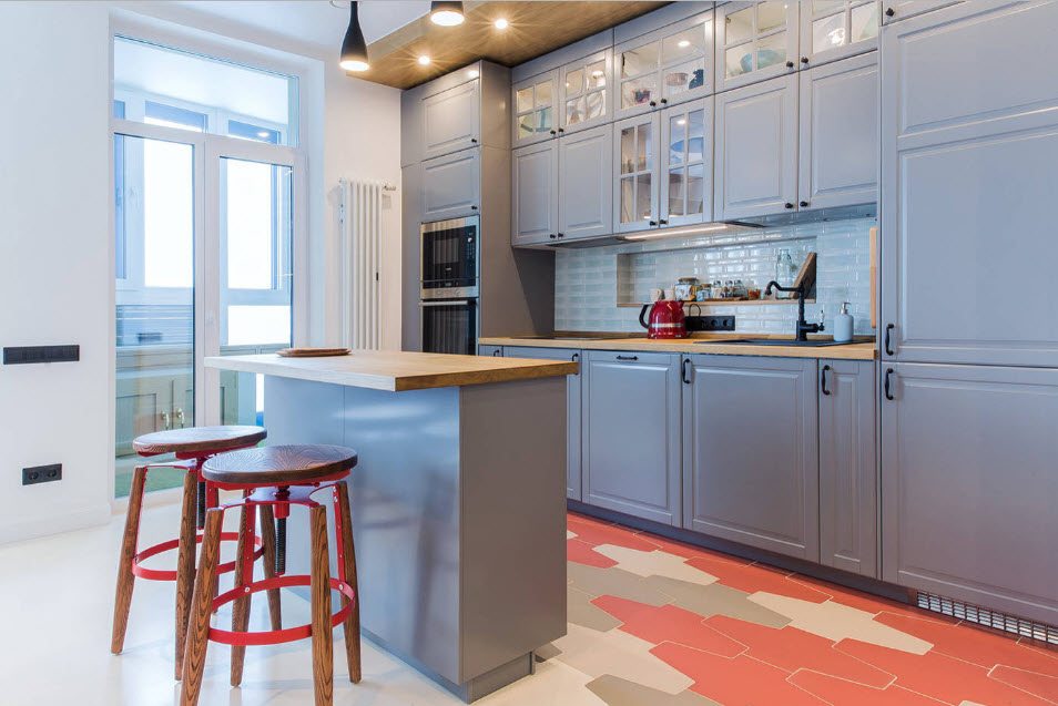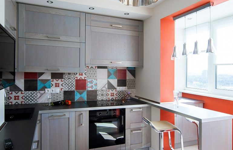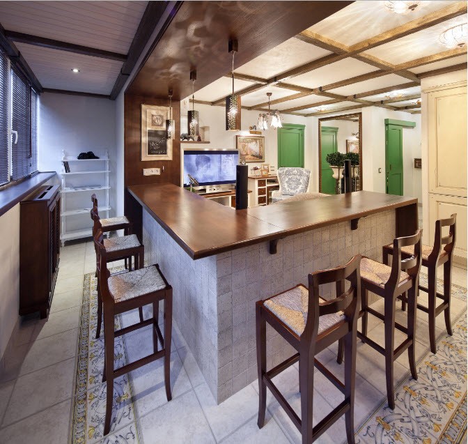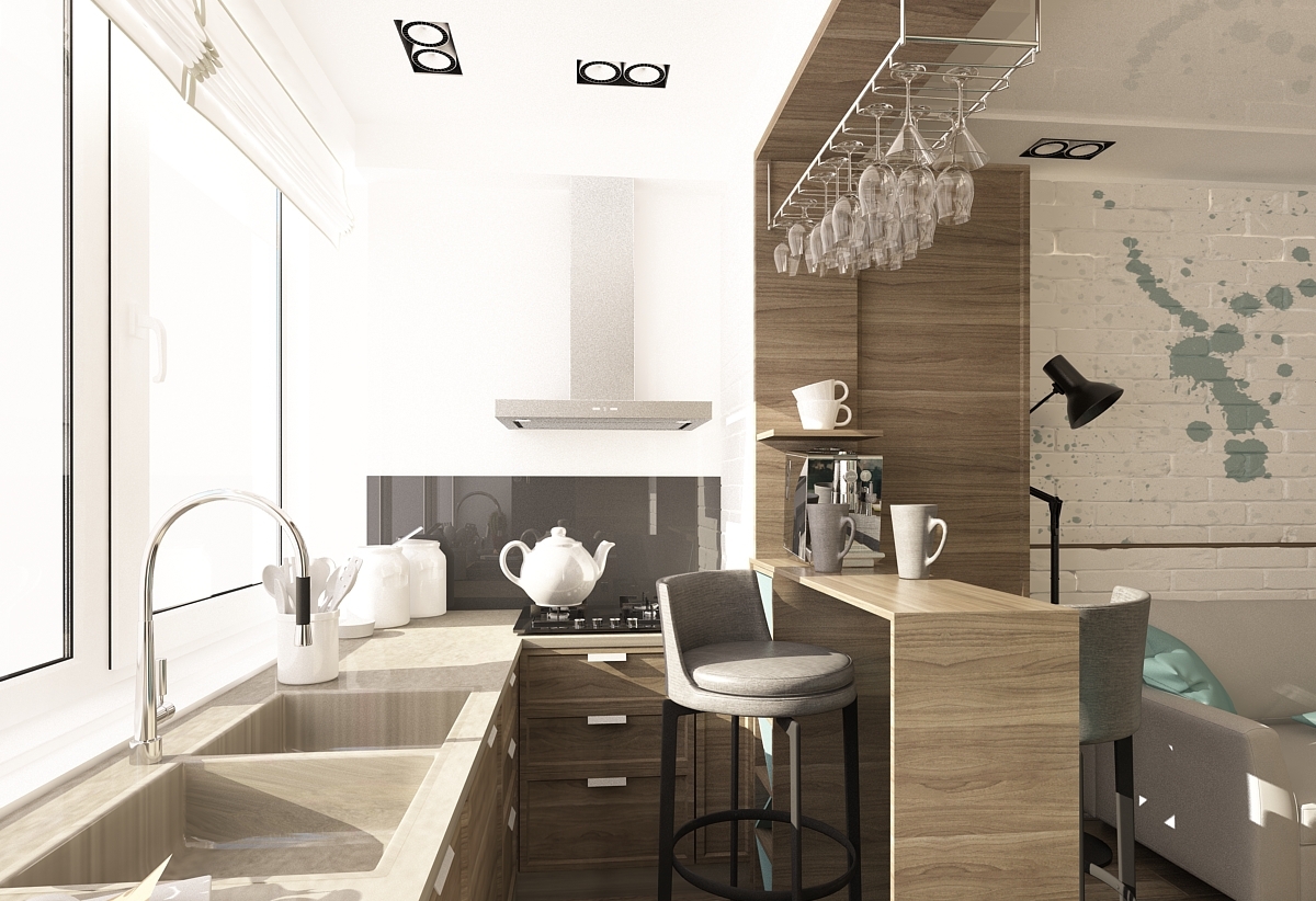 An original solution for the interior of a kitchen with a continuation balcony will be the use of a window sill as a bar counter. This will allow not only to bring the necessary atmosphere into the interior, but also to break the space into zones. The bar counter will become an additional functional space or sort through the function of the dining table (if the kitchen is small).