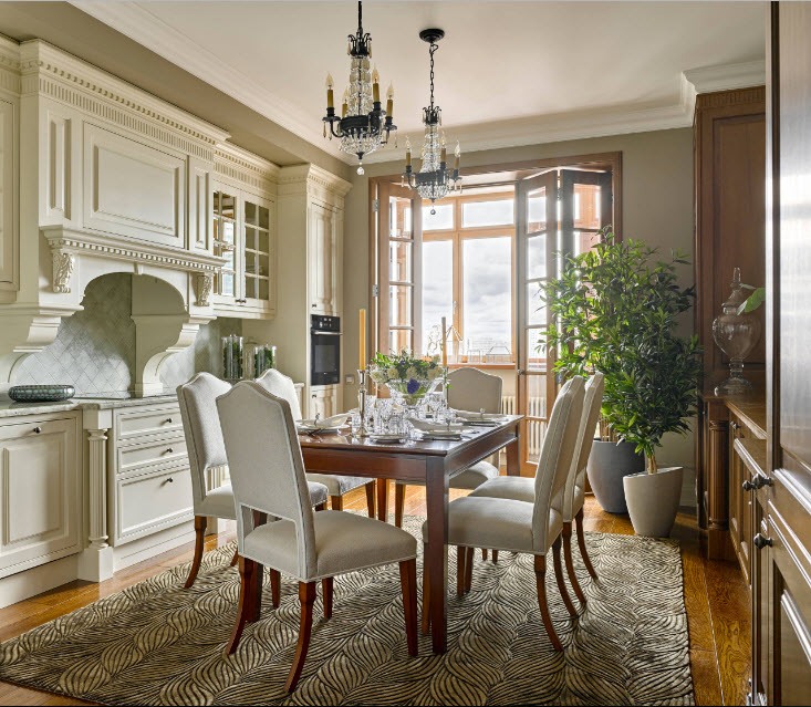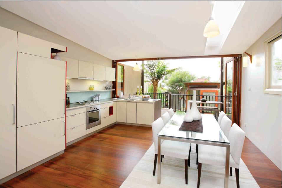 The most comfortable solution will be the use of bright colors in such a dining room. This will visually increase the space and make it more airy and light.