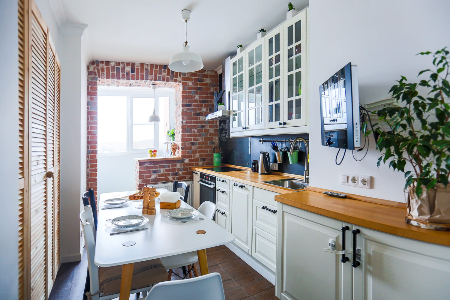 Huge balcony windows allow you to make the kitchen more light and airy. A big plus will be placing them on the sunny side. Then the light will not only illuminate, but also warm the room, which is very preferable in the cold season. But in the summer it is better to use blinds or curtains.