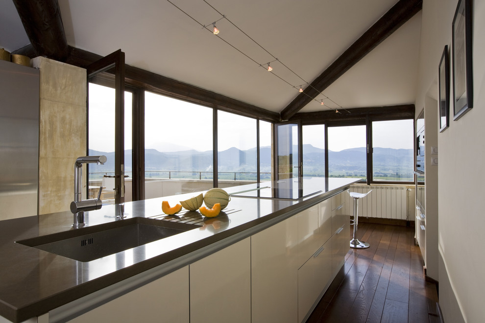 An unusual and very effective option, a novelty will be the use of the space of the balcony as an office. The kitchen at the same time becomes part of it. This combination cannot be denied as bold and even shocking. What connects the study and the kitchen? How can I cook soup and type on my computer? These questions are most likely rhetorical. However, it is convenient, probably, to drink tea without leaving your workplace.