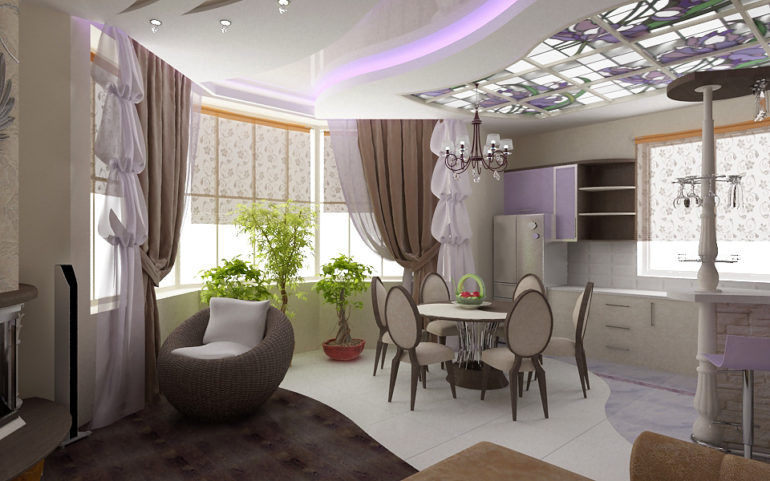 The design of the kitchen with a loggia can be absolutely diverse: ethno-style, classic, modern, Provence, baroque, hi-tech, etc. The color palette and texture - their choice depends only on the imagination and desire of the owners.