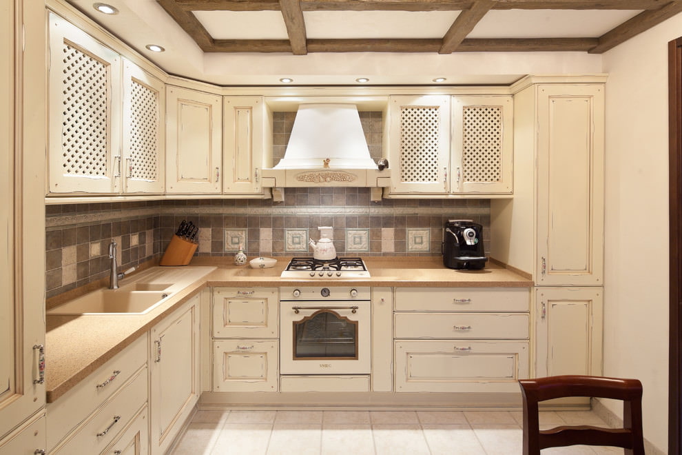 Kitchen sets in Italian cuisine should be made of massive boards, equipped with wooden open shelves with forged mounts. Perfect in Provence style. Thus, a bright interior is created, which is characterized by a slight randomness, but precisely because of this, the space becomes cozy.