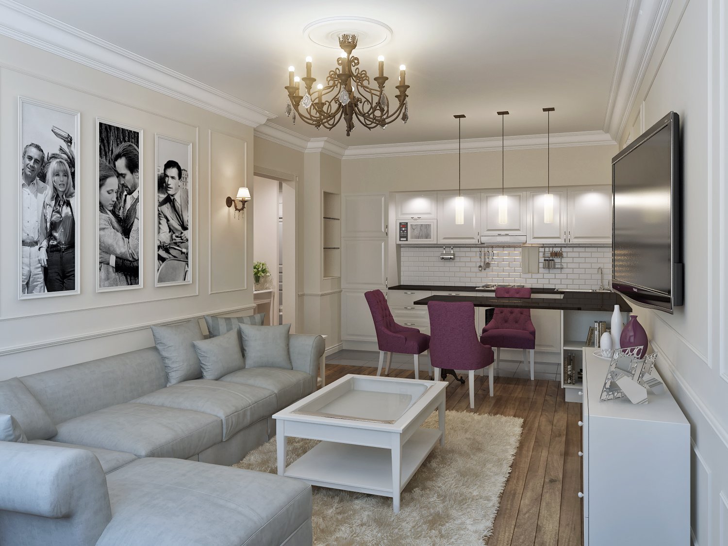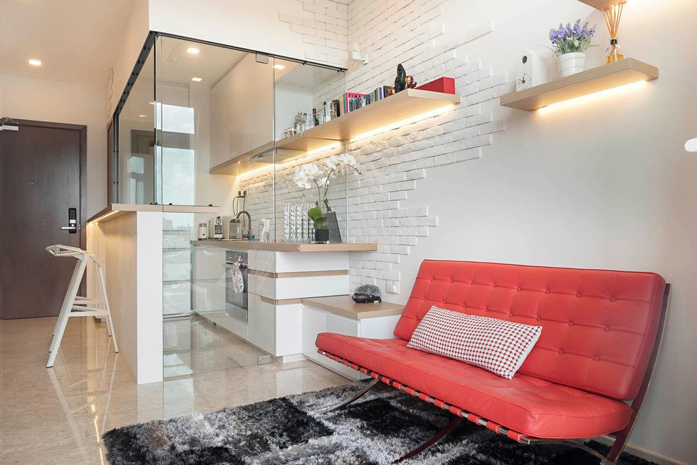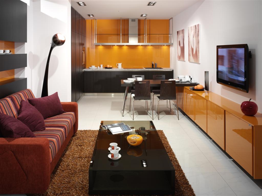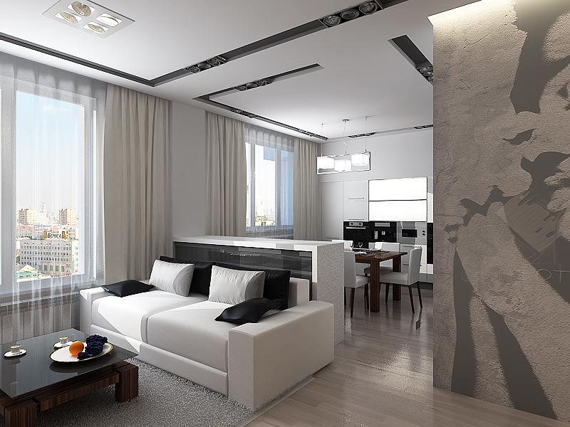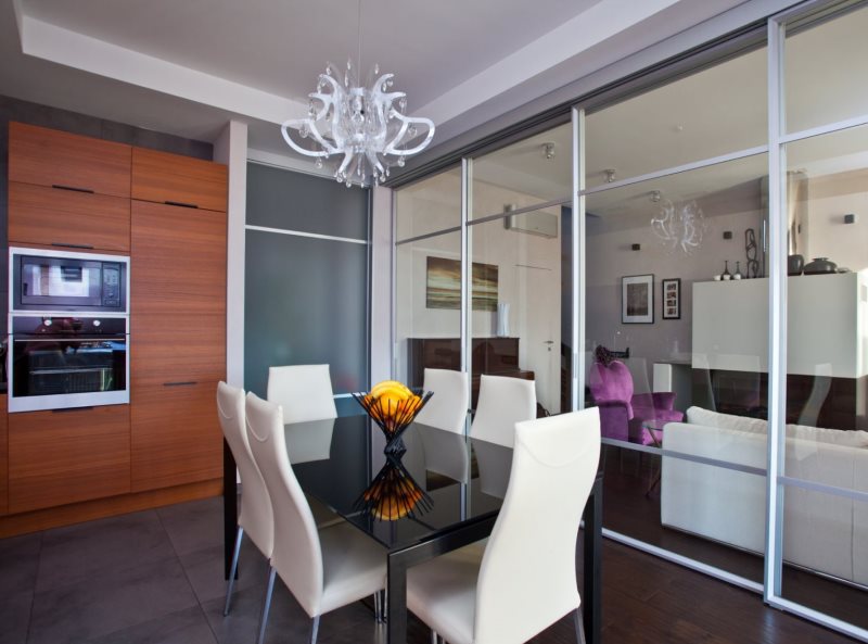 Lighting is bright with additional illumination of the working area in the kitchen. The partition between the areas of glass or plastic. The same color scheme of walls and furniture. Dynamic, spacious and technological modern design.