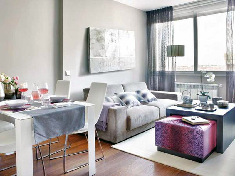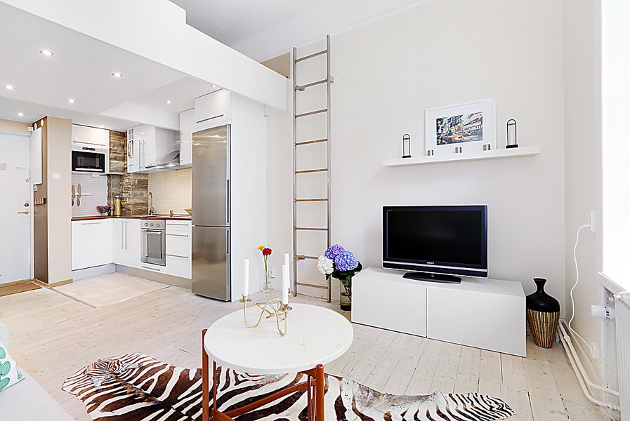 The predominant white color on the walls. The correct straight lines in the furniture and the minimum number of decorating elements - it is advisable not to curtain even the windows, and put many indoor plants on the windowsills. Accents on the walls in the form of a working apron in the kitchen or partitions between zones are desirable only from natural materials: wood, stone and brick.