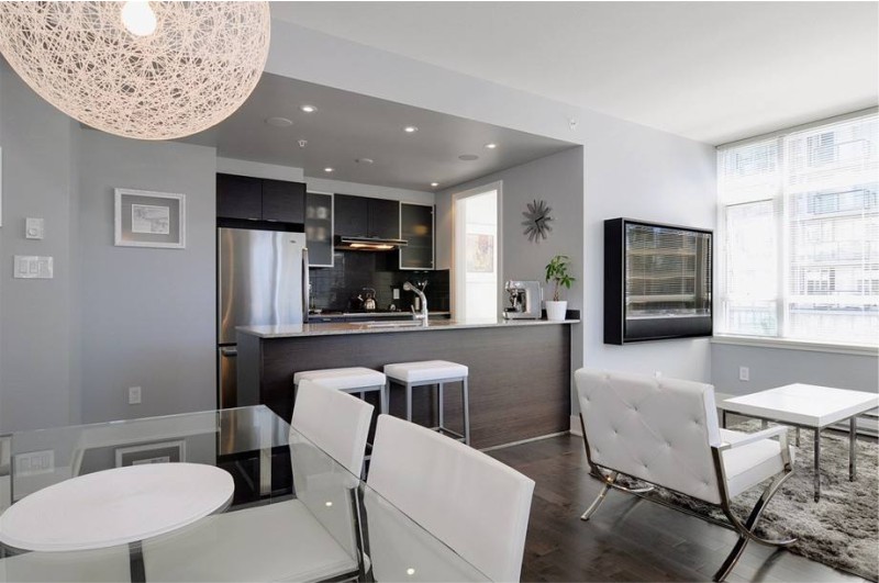 The style of modernity and manufacturability with a predominance of parts made of materials such as glass, metal and plastic. Lack of additional decor and a lot of modern built-in appliances. The predominant colors in the interior are white, gray, black in combination with metal and glass glossy surfaces that reflect light.