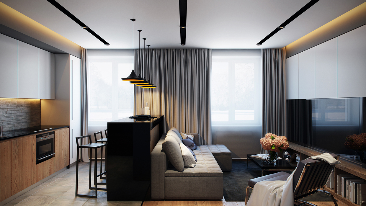 Choosing minimalism, you get a modern, elegant and functional interior of the kitchen-living room