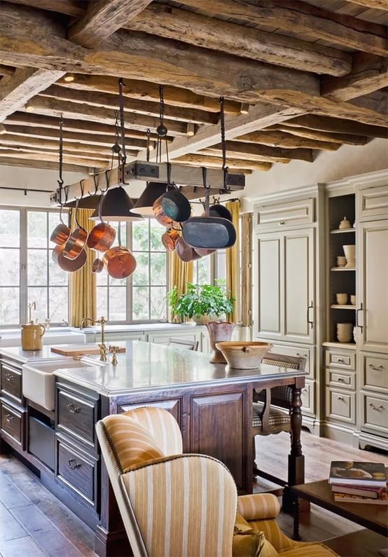 In rustic kitchens, the ceiling is often lined with wood, choosing its shade depending on the style of the kitchen