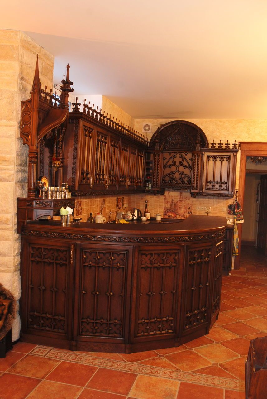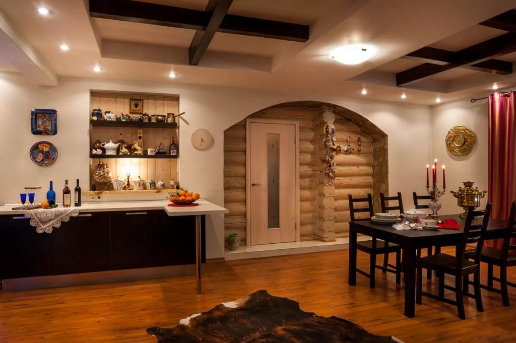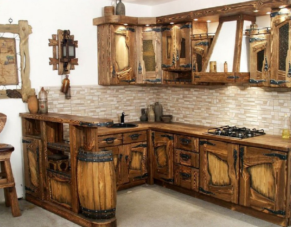 The kitchen looks old with a unique bar counter made of solid wood, such as pine. Today, bar racks with decorative beer barrels that act as legs or simply stylishly decorate the interior are in fashion.