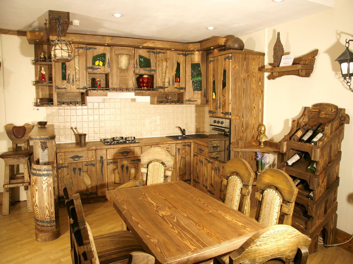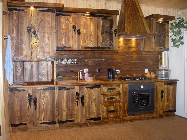 Carved, decorated furniture is more suitable for urban apartments, but not for a summer residence, where rude, simple cupboards, cabinets and countertops are more appropriate.