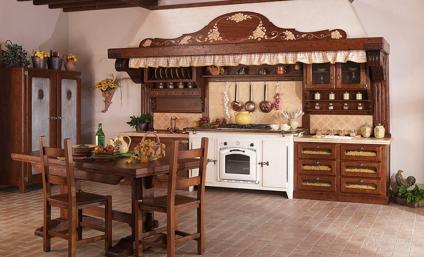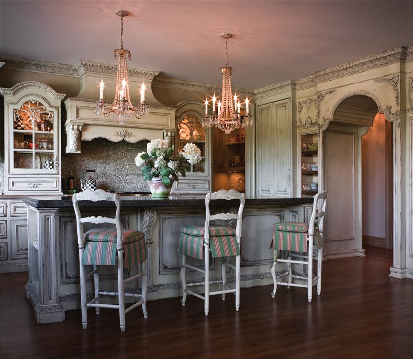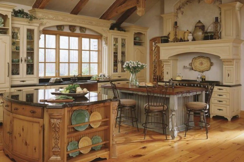 For rustic styles, massive oak wood headsets are suitable, while for more romantic ones, light wood furniture, such as pine trees, are suitable. Beautiful antique kitchen sets can be decorated with gold, ceramics, carvings, decorative and transparent glass.