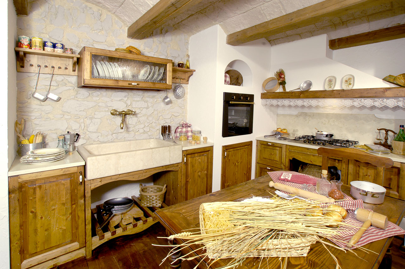 A typical example of antique kitchen finishes - wooden beams on the ceiling, ceramic tiles in natural stone on the floor