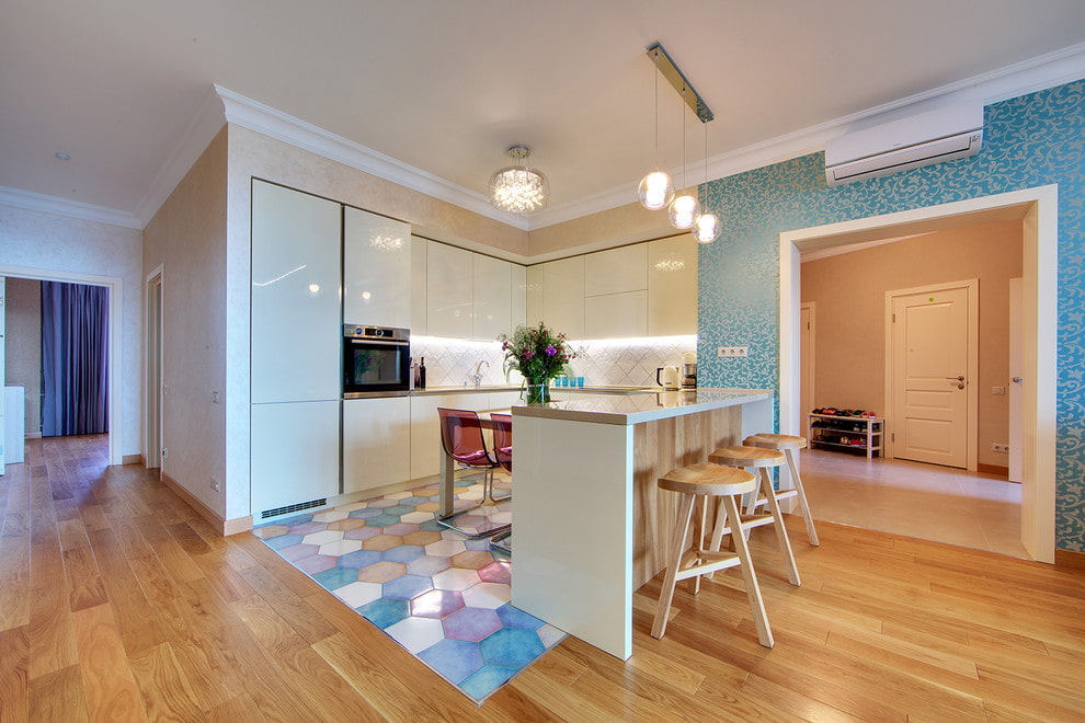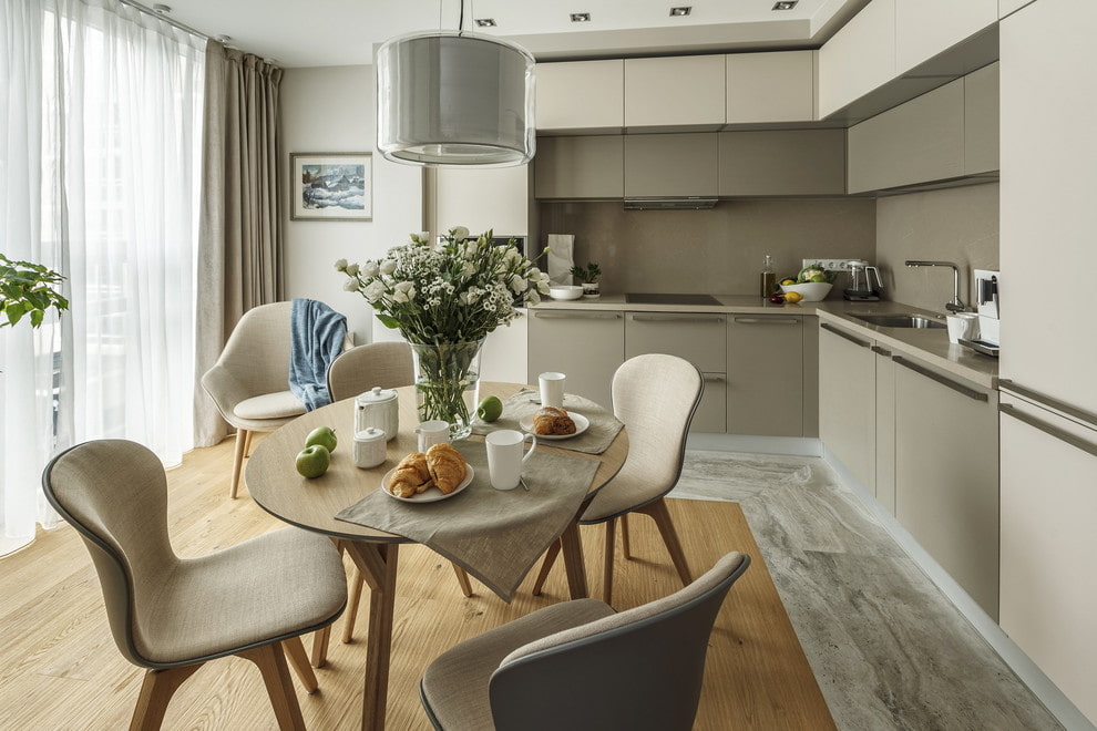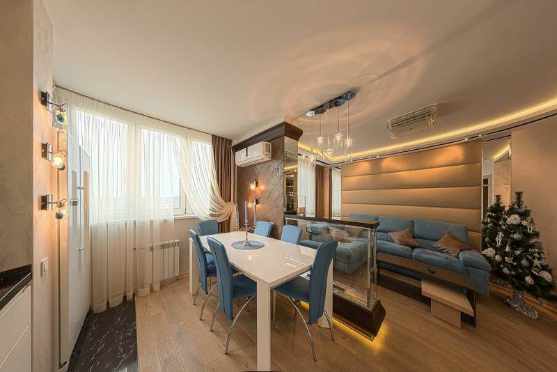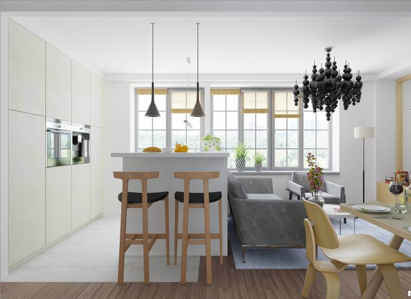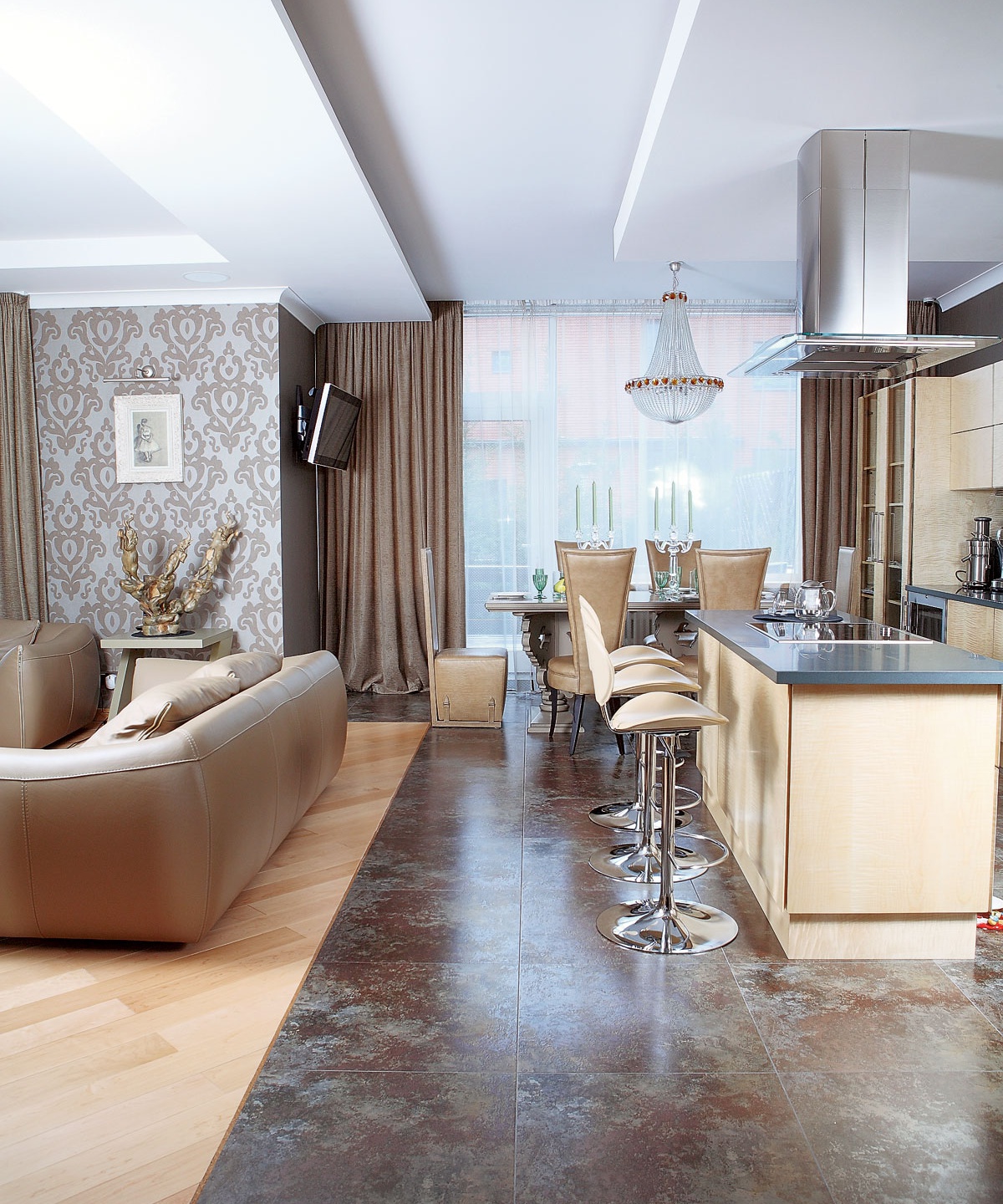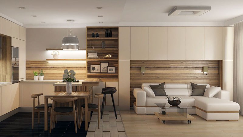 With the help of a laminate, space visually changes. In studio apartments, they often make a combination of the kitchen and the living room. Using the same laminate in the living room and dining area, you can expand the room.
