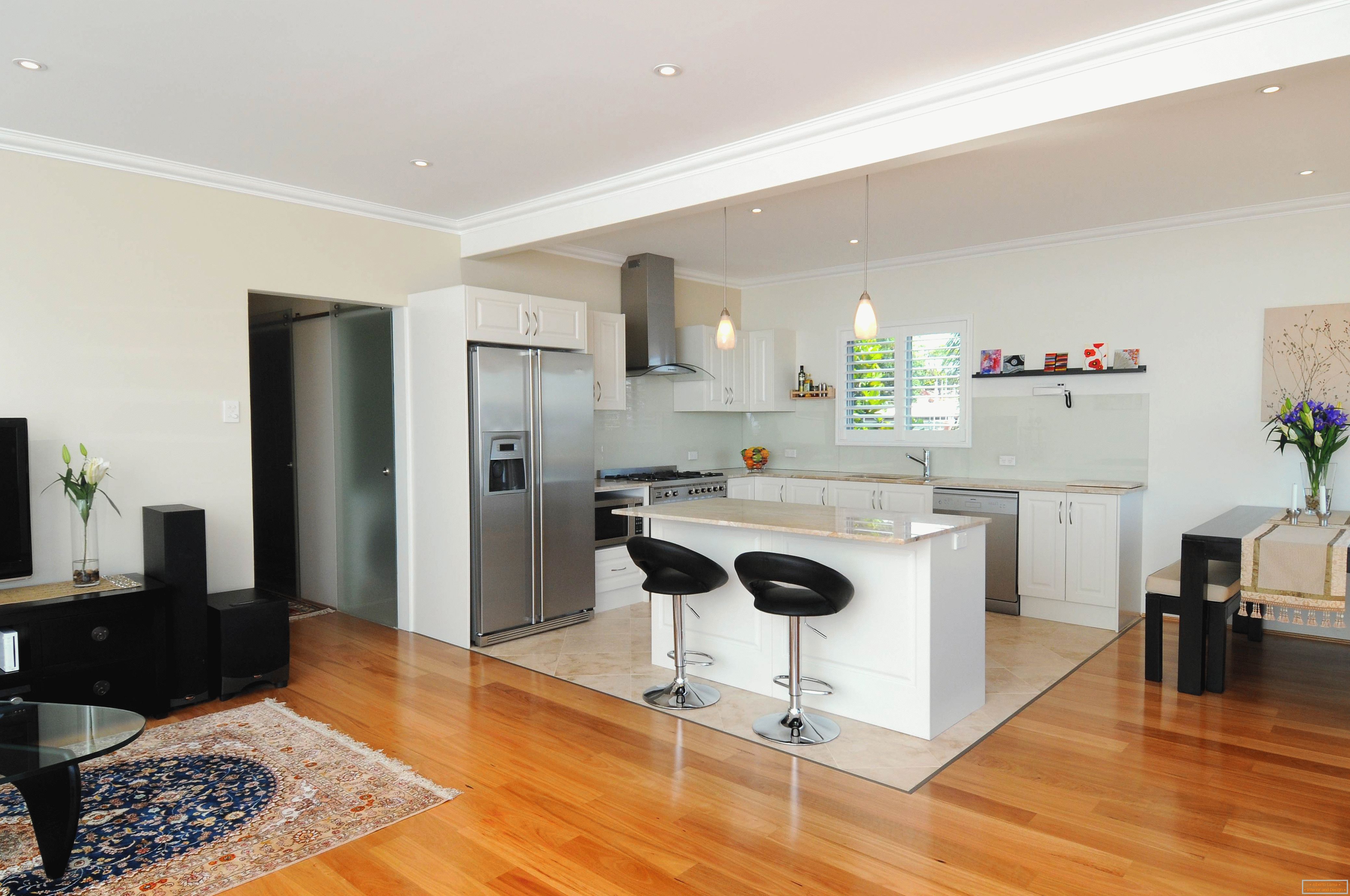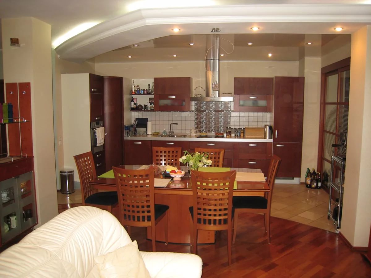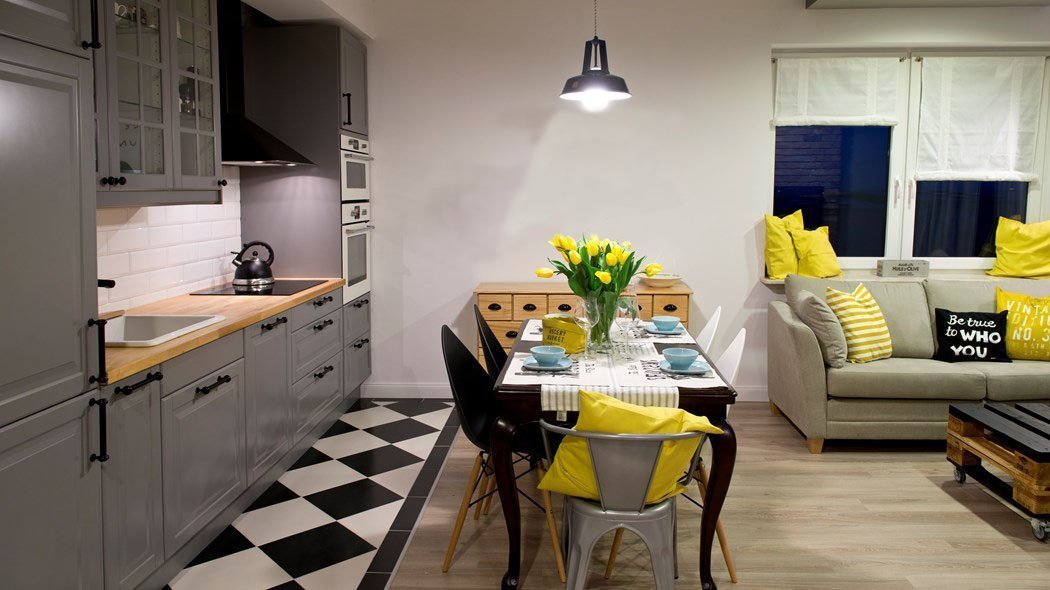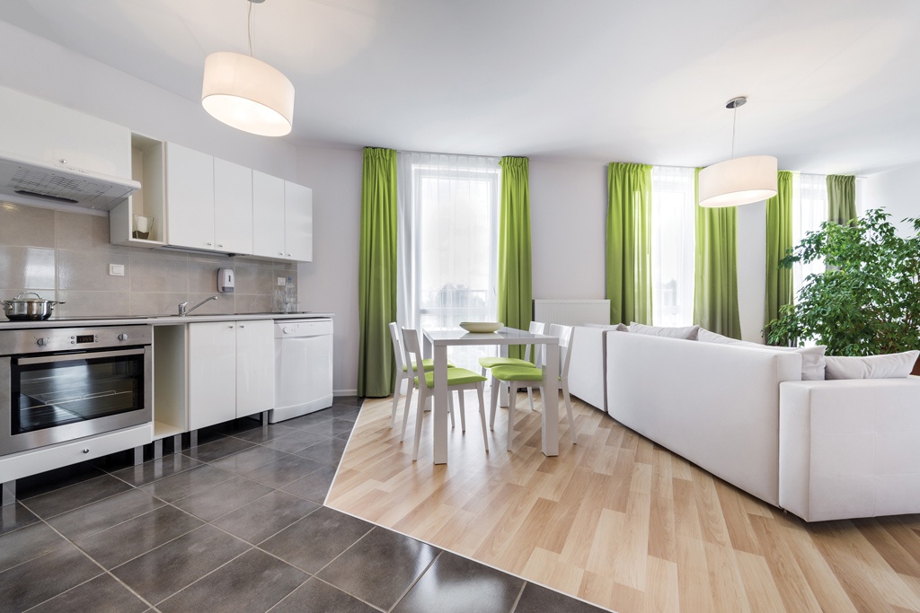 With the help of a laminate, space visually changes. In studio apartments, they often make a combination of the kitchen and the living room. Using the same laminate in the living room and dining area, you can expand the room.
