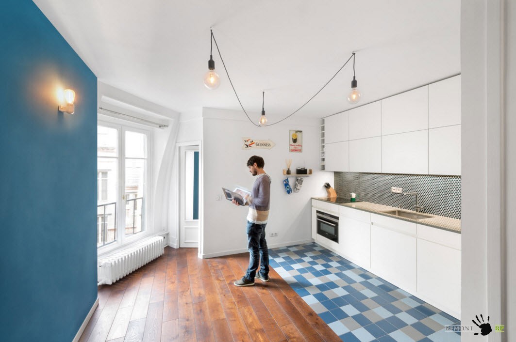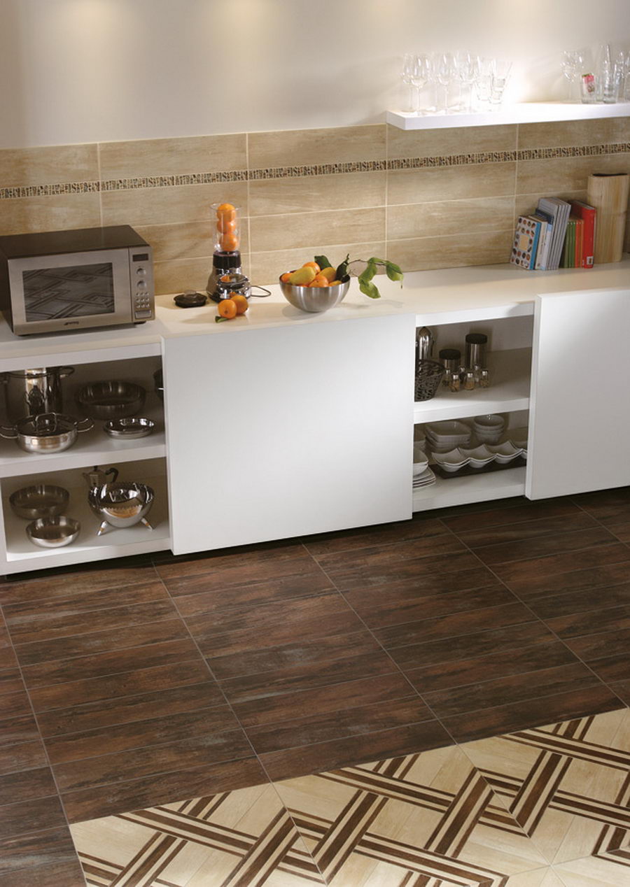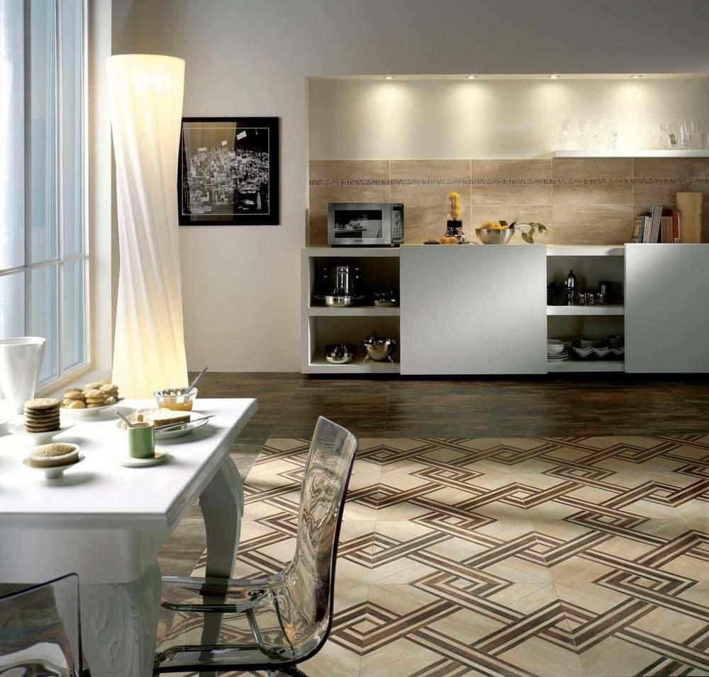 In small rooms, the tiled floor will look like a kitchen apron, and in kitchen studios - as two separate zones (work and dining).