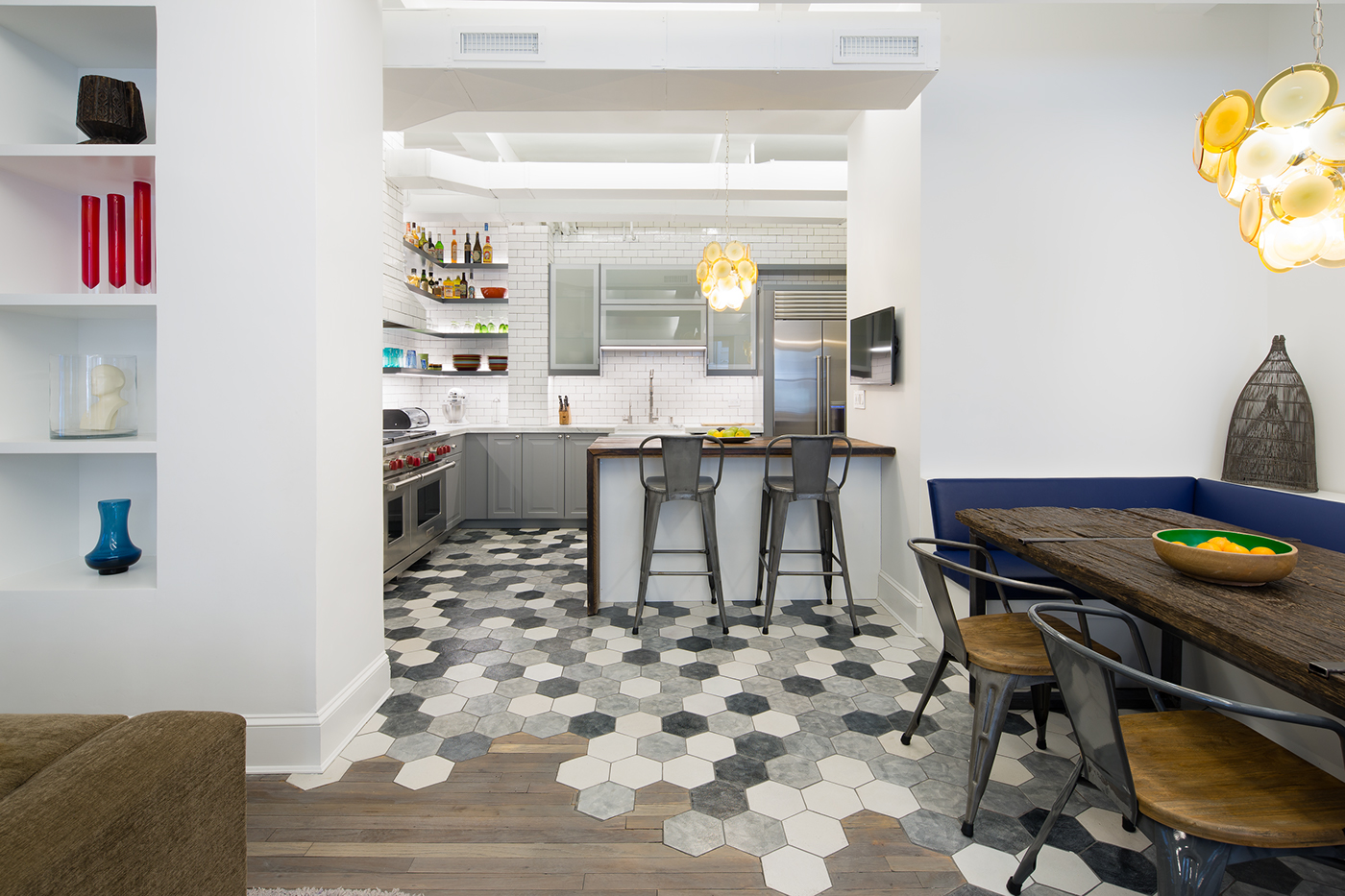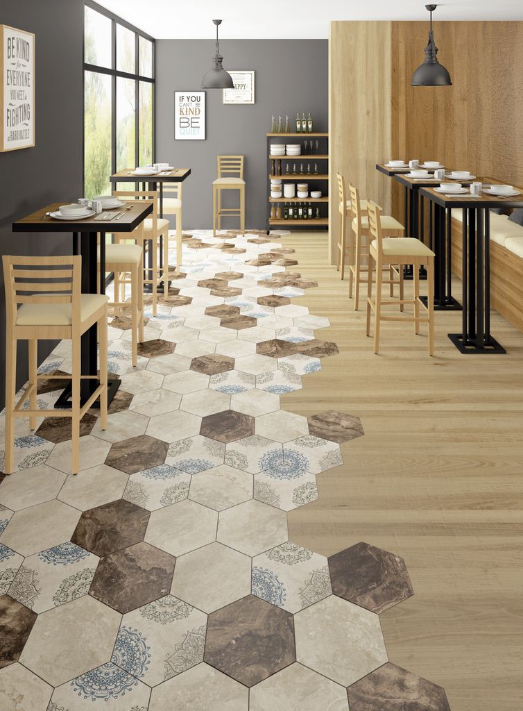 The type of joint is chosen by the owners from their preferences and the usual "trajectory" of movement in the kitchen. The border divides the room into equal parts or islands in a proportion of 1/3, where one third is allocated to the working area, and two to the dining room. To get bizarre outlines of the zones, use a hexagon tile in the shape of a honeycomb.