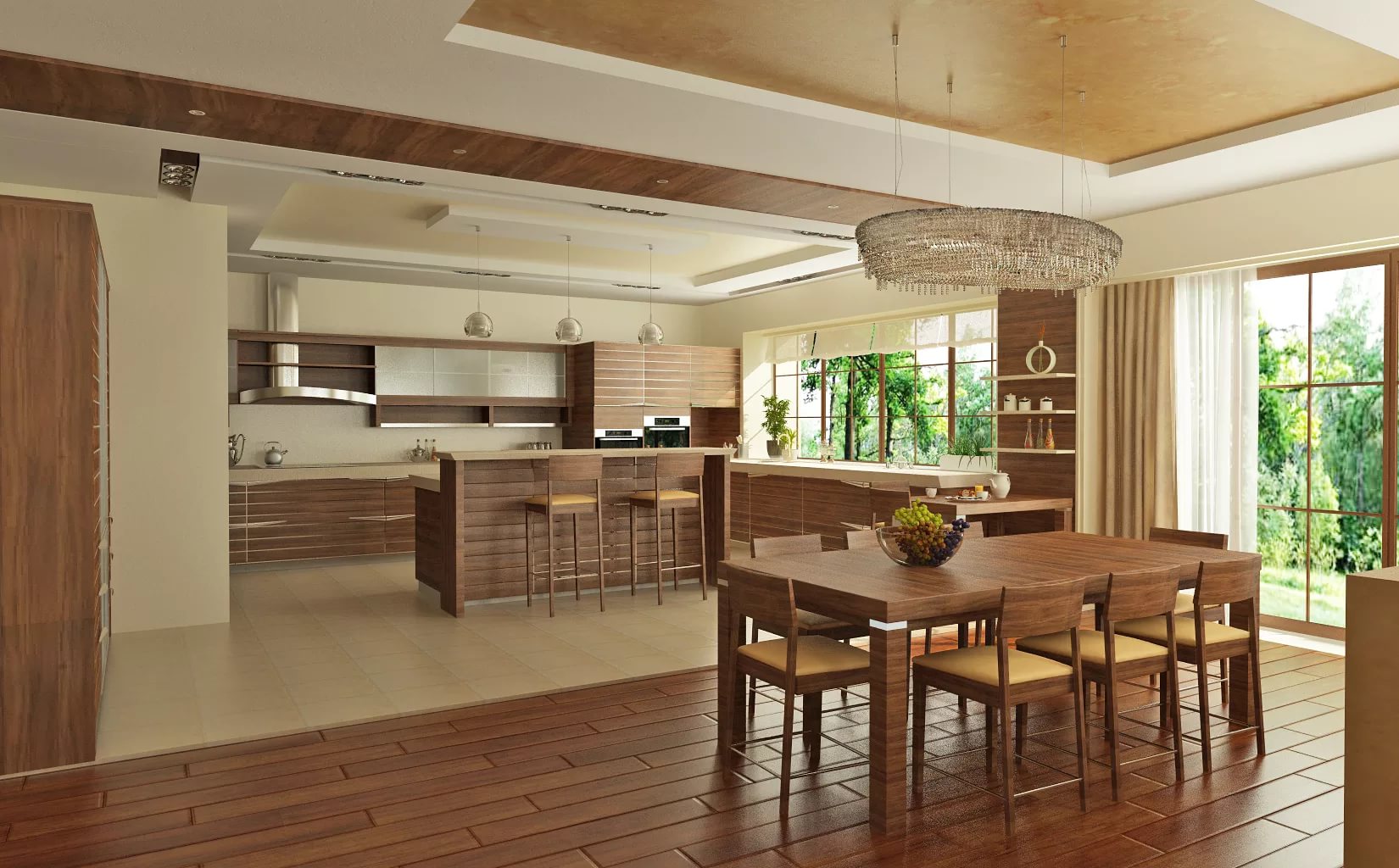 Based on the purpose of the kitchen, choose fire-resistant materials that can withstand high traffic and mechanical damage, having a moisture-resistant coating or an additional layer of waterproofing. A tile is suitable for the working area, and a laminate for the dining room. The connecting seam is made in the form of a straight or curvy line.