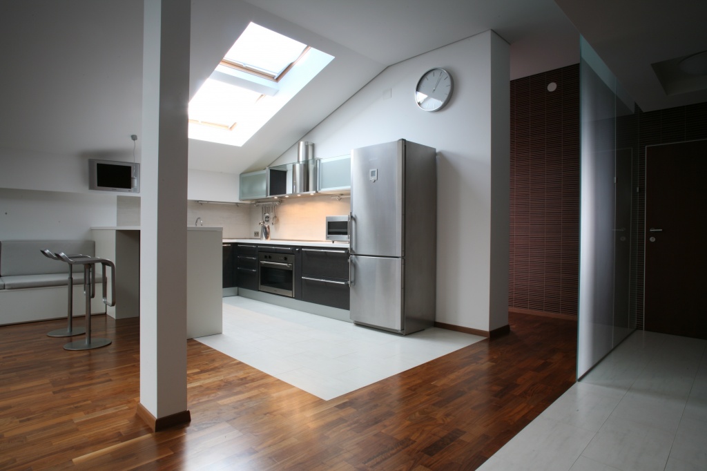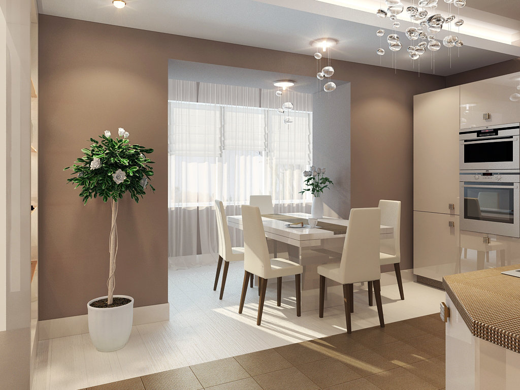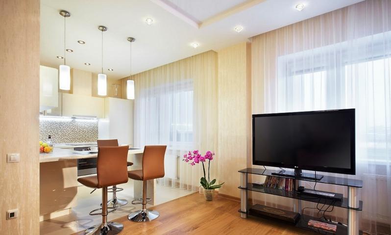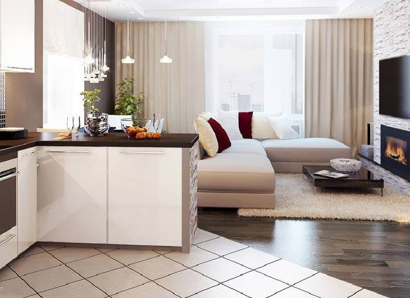 Such a combination looks optimal in studios, as well as in combined rooms that perform several functions simultaneously - a kitchen + living room or kitchen + dining room.