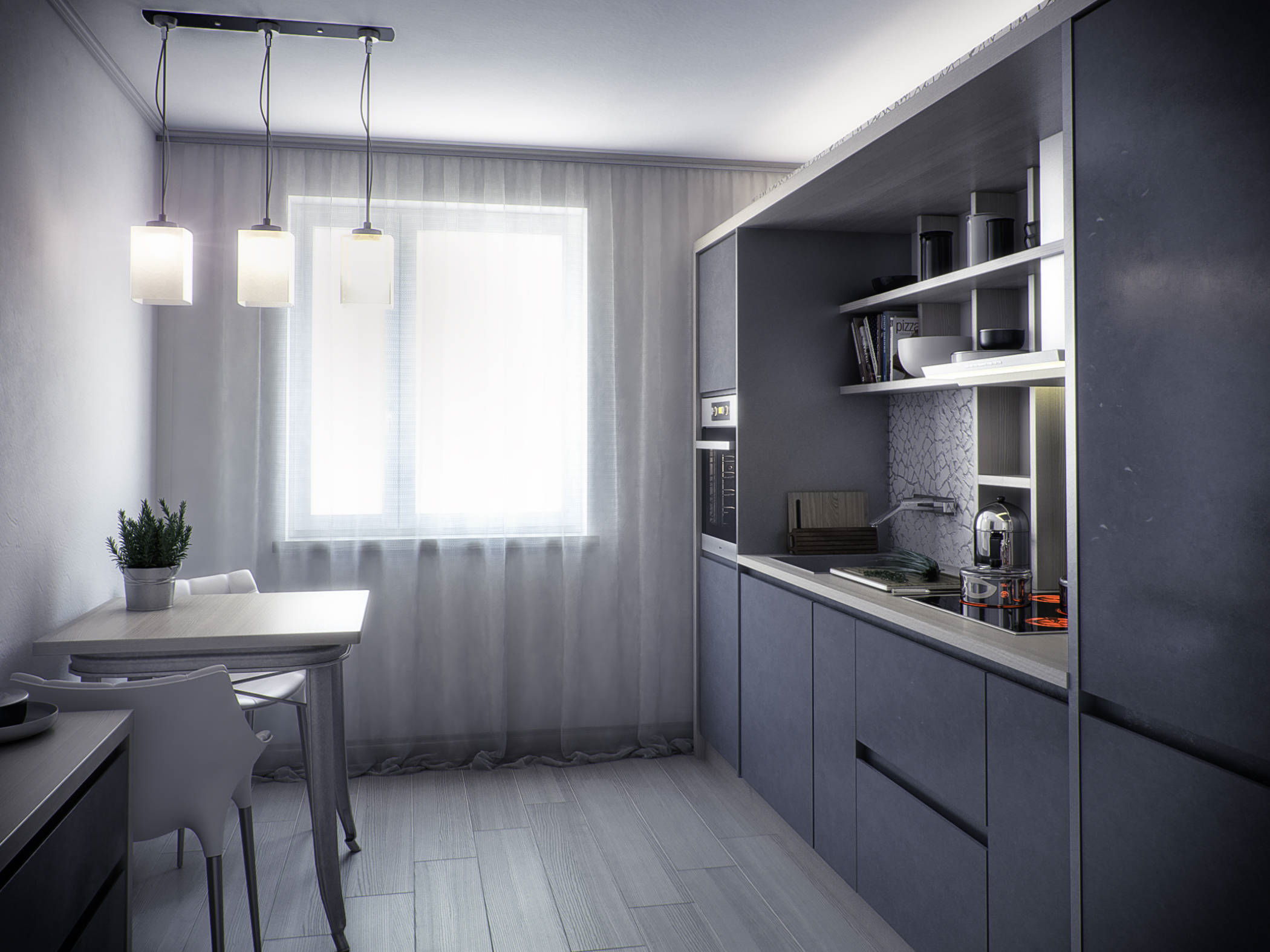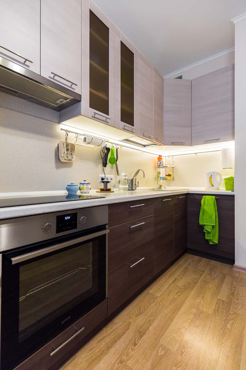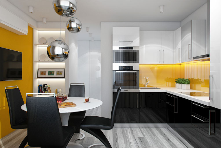 Countertops are best bought in white. So on a general dark background, highlight the cooking area. Spotlights above the countertop are required. Choose a cold glow or warm (at your discretion).