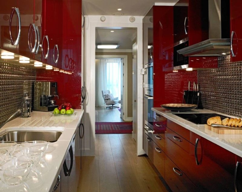 A kitchen unit is purchased from MDF or particleboard. Natural wood is not necessary to buy here. The color palette of the facades of the upper and lower cabinets will alternate with red and black (dark brown) shades. It is best to highlight a couple of facades of cabinets that will have a contrasting purpose (painted in red).