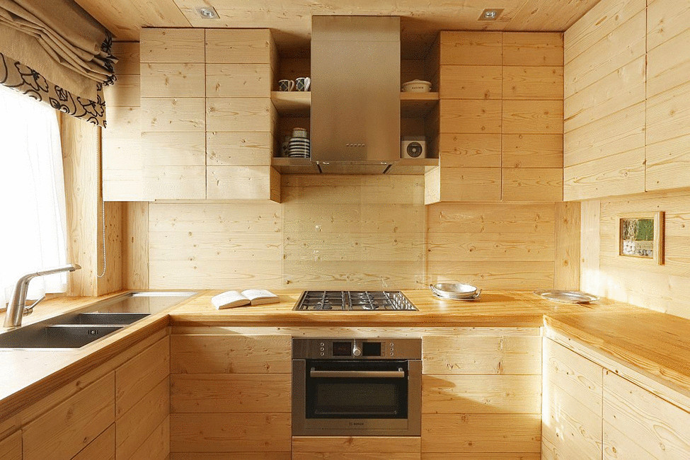 The kitchen set is purchased from natural wood. Color does not need adjustment - natural shades of wood will do.Choose a light, white countertop. Finish the kitchen apron with the same tiles as the window openings. This may be a continuation of the cascade of tiles.