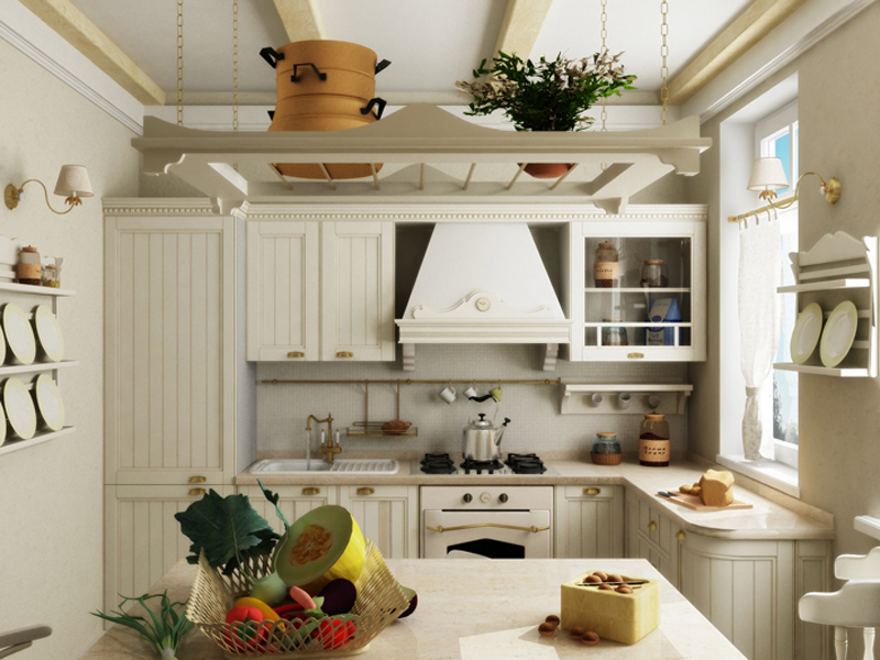 On a white ceiling, hang a wooden frame. Put dried herbs, spices, bagels on a rope on it. This approach will express the ancient motives of the ancestors. Do not forget to build a semblance of a Russian stove or fireplace with tiles.