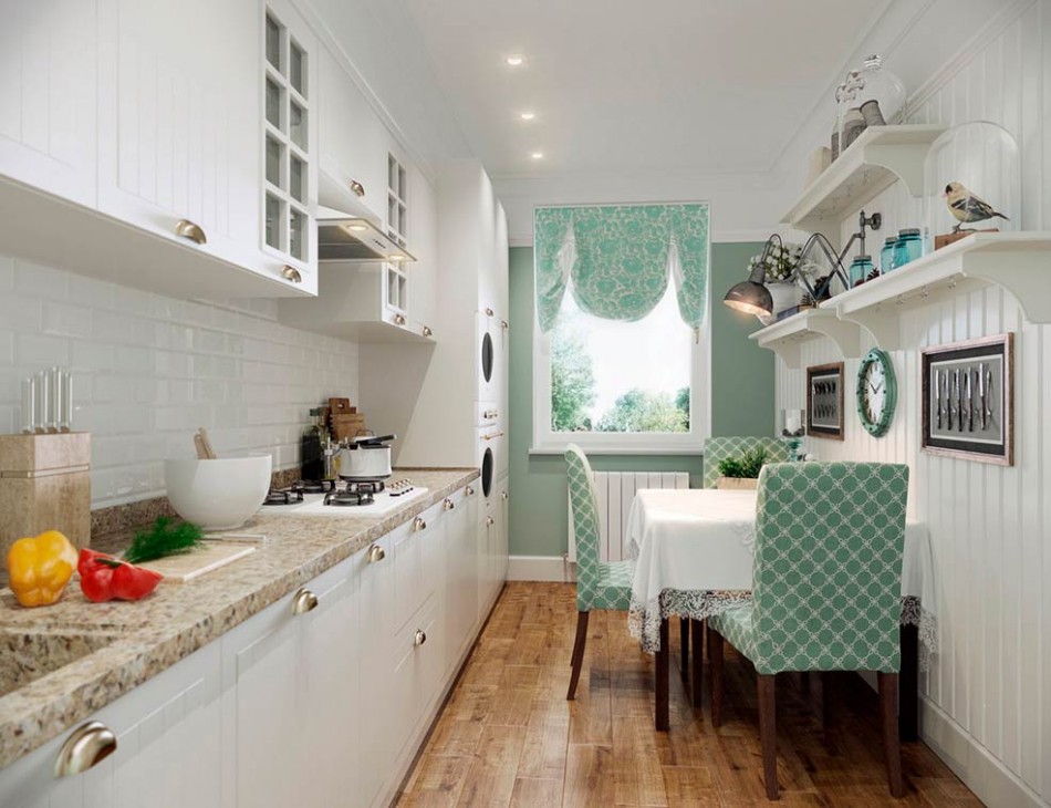 In the kitchen area of 9 square meters, you can use various ways of arranging furniture. If the room has the shape of a square, it is worth looking at the parallel layout