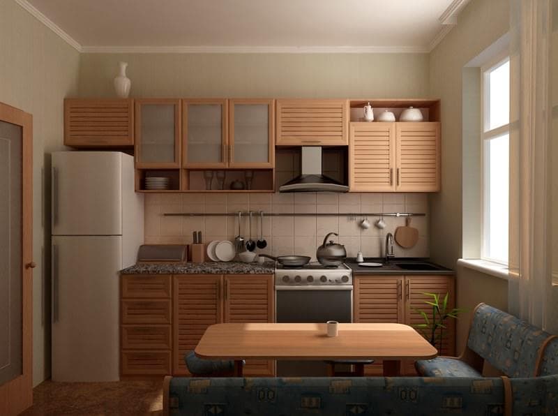 To get as close as possible to the future design of a small kitchen of 9 square meters with a refrigerator as in the photo below, it is better to draw a perspective sketch.