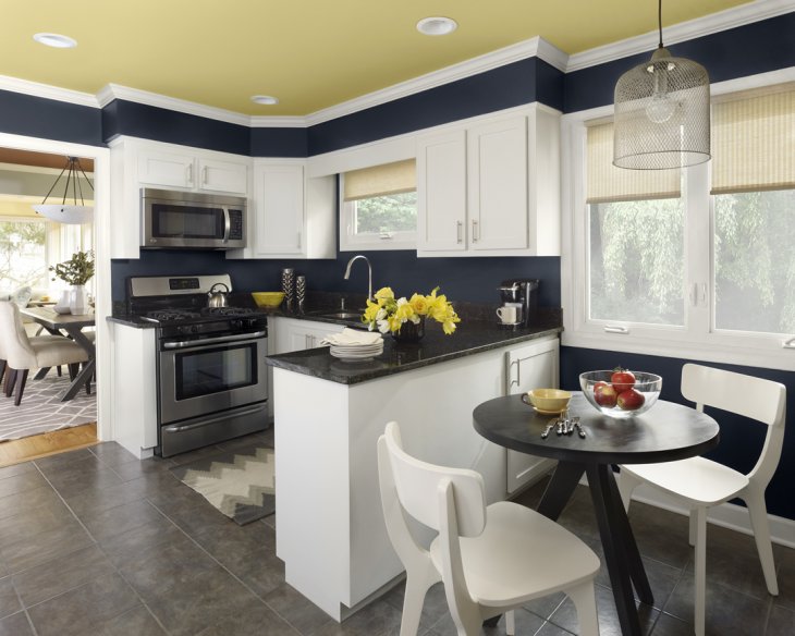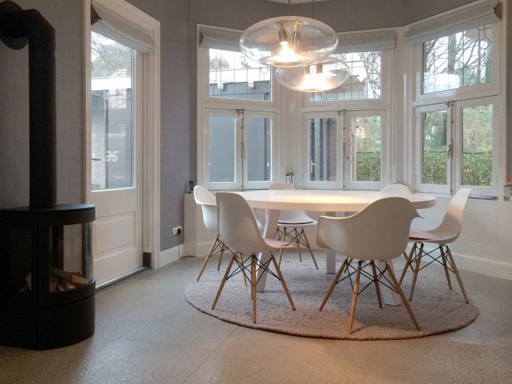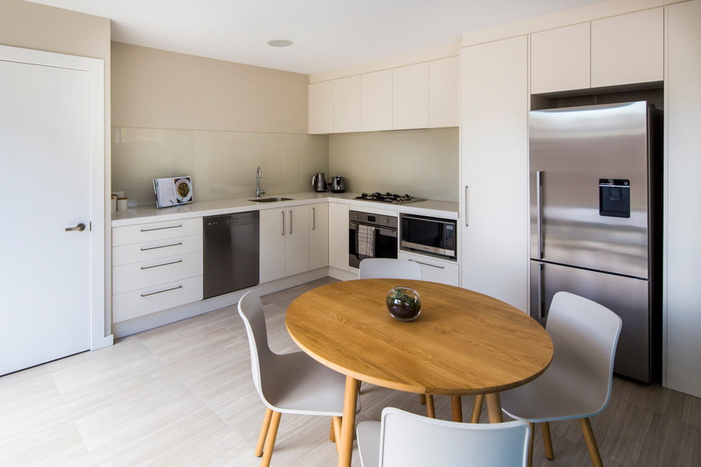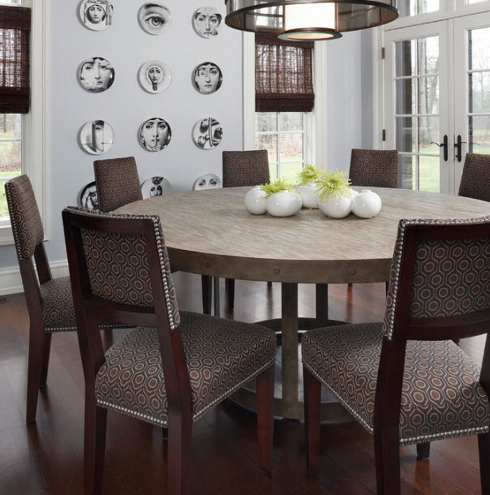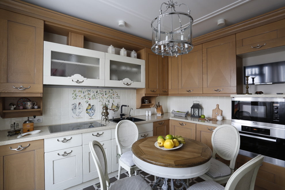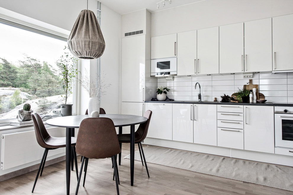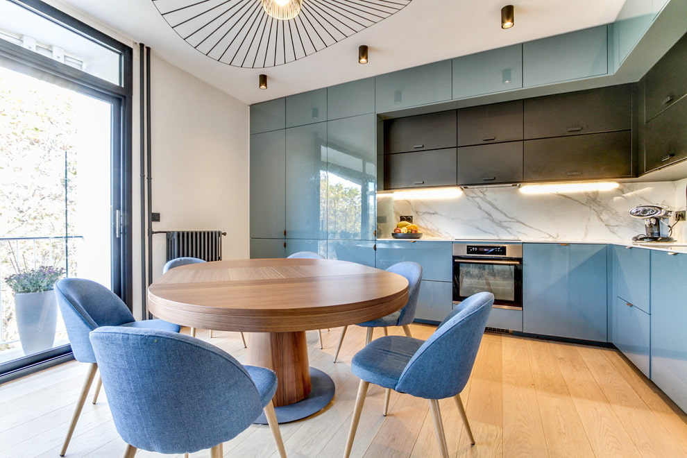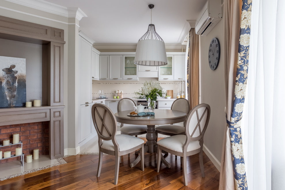 A round table on the kitchen makes the interior of the room noble and sophisticated.