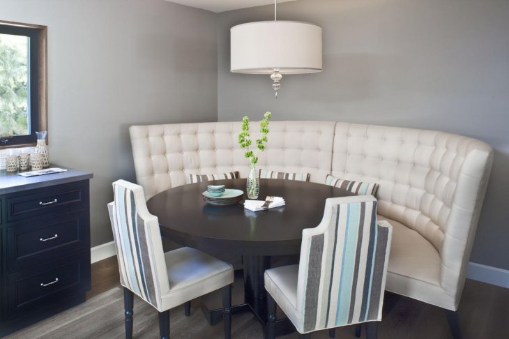 White color often becomes the choice of housewives who want to make the interior of the kitchen more refined and elegant. Such a product adds a touch of freshness to the interior and visually increases the space. The dining area in white tones will be perfectly combined with both a light and a dark set.