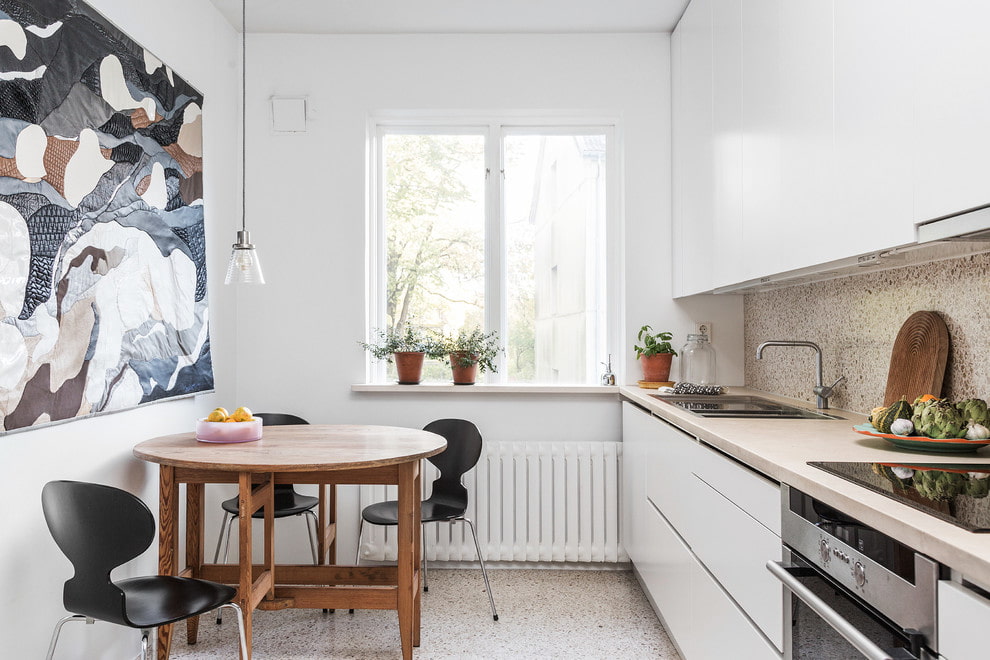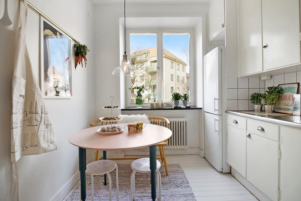 To resort to tricks and get a transforming table will be an excellent solution for a small kitchen.Thus, when folded, the table will not take up much space and will look organically in space, but if guests come to the house, the table can be transformed and more people can be placed at it.