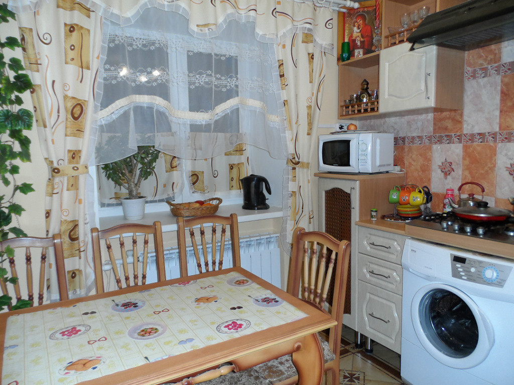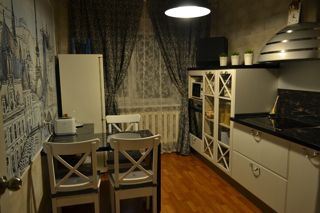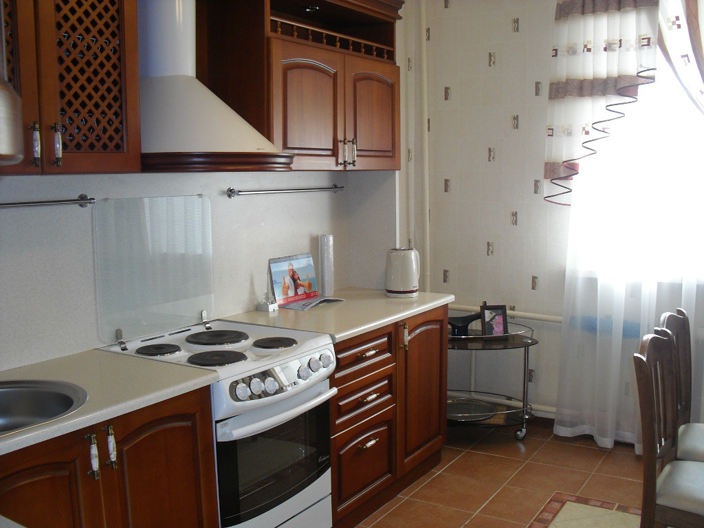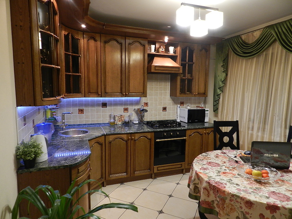 In the kitchen with an area of about nine square meters, not only all the necessary furniture, but also household appliances will be conveniently located. Such a standard for multi-storey panel houses, if desired, is redeveloped. This will require the help of a specialist who will do everything, taking into account the wishes of the customer, as well as coordinating the plan with local authorities.