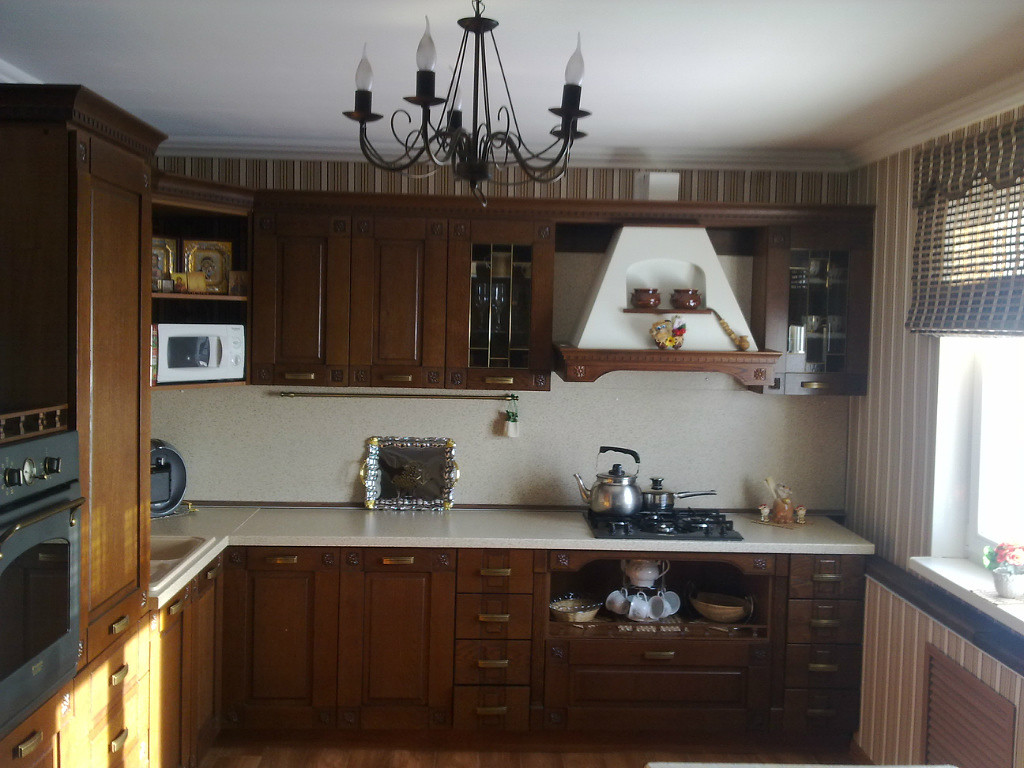 - U-shaped - kitchen furniture is placed about three walls. With this method of placement, everything you need can easily fit in, therefore, in order to free up more space for the dining area, it is permissible to order a little more standard ones.