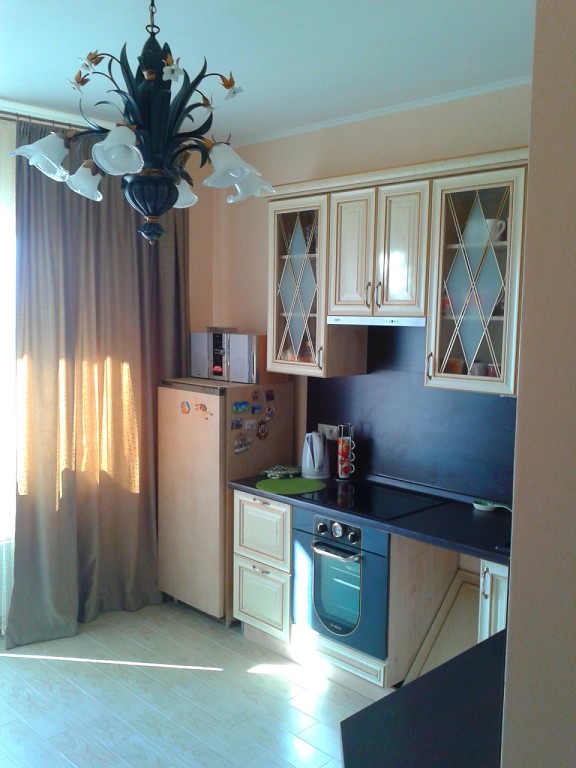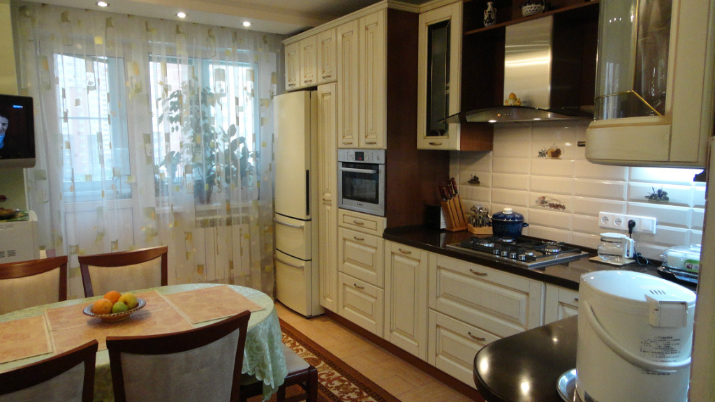 After combining the room with the loggia, the apartment will have a full kitchen for cooking and a spacious dining room for the whole family
